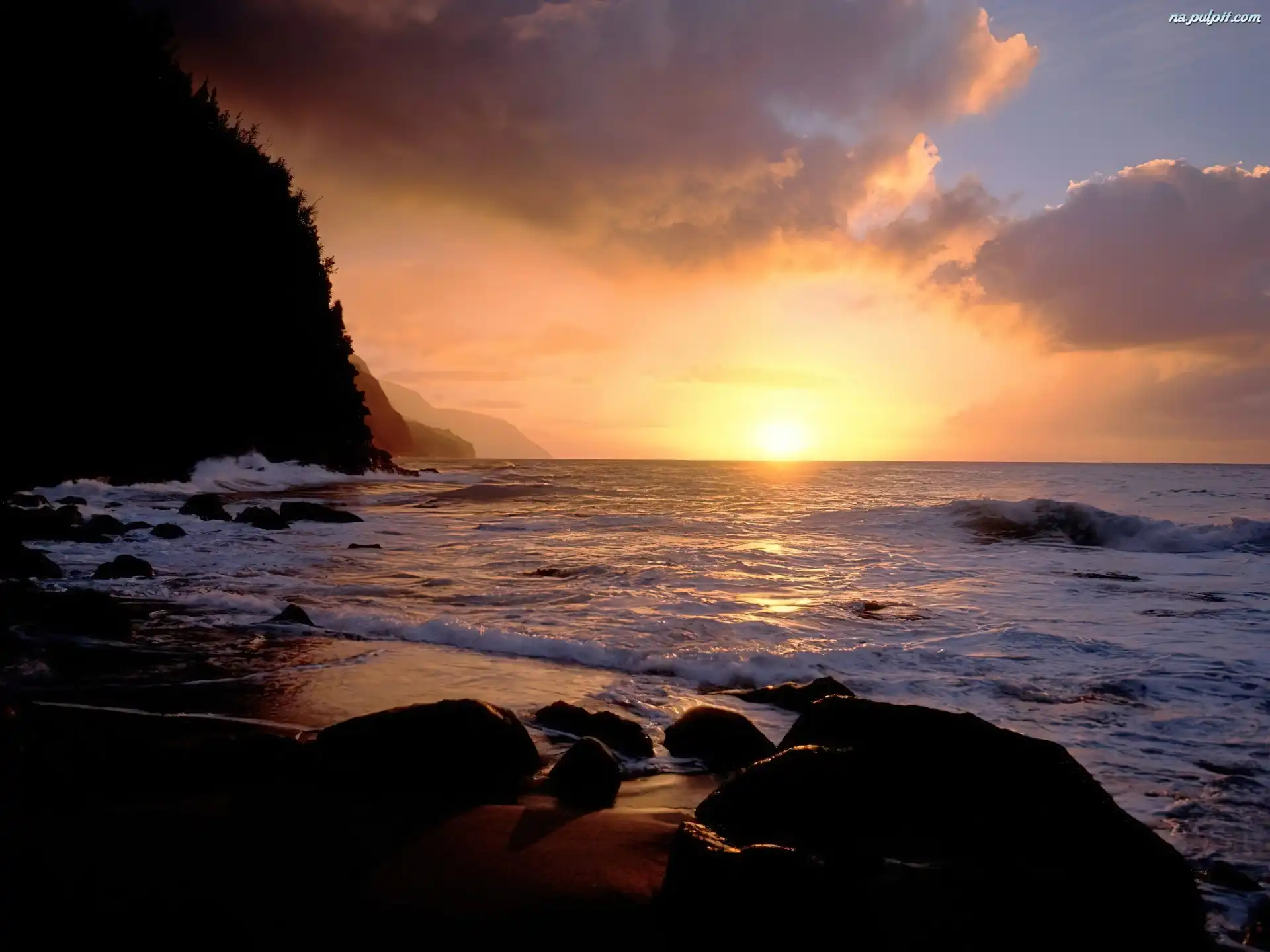 Zachód Słońca, Plaża, Fale Fioletowe, Chmury Chmura, Francja, Zamek Morze, Zachód, Palma Opadające gałęzie, Zachód Słońca Księżyc, Niebo, Noc, Chmury Morze, Statek Wojskowy, Góry Zachód Słońca, Drzewo Niebo, Chmura, Góry, Las Morze, Drzewo, Skała Kamyki, Plaża, Fale Zachód Słońca Chmury, Szczyty, Górskie Palmy, Plaża