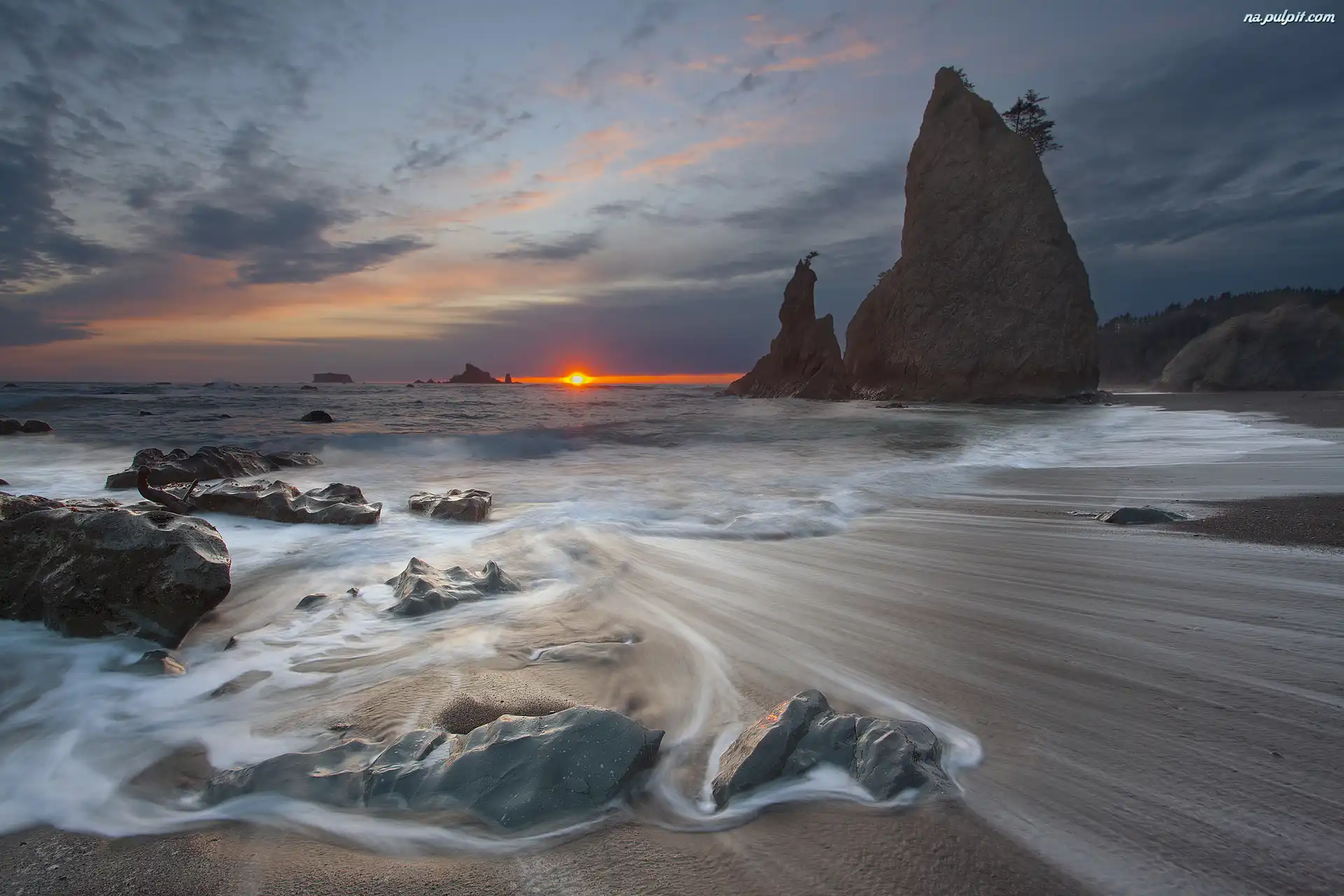 Zachód Słońca, Kamienie, Fale, Plaża, Skały
