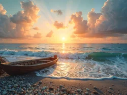 Fale, Morze, Łódka, Zachód słońca, Plaża Na Pulpit