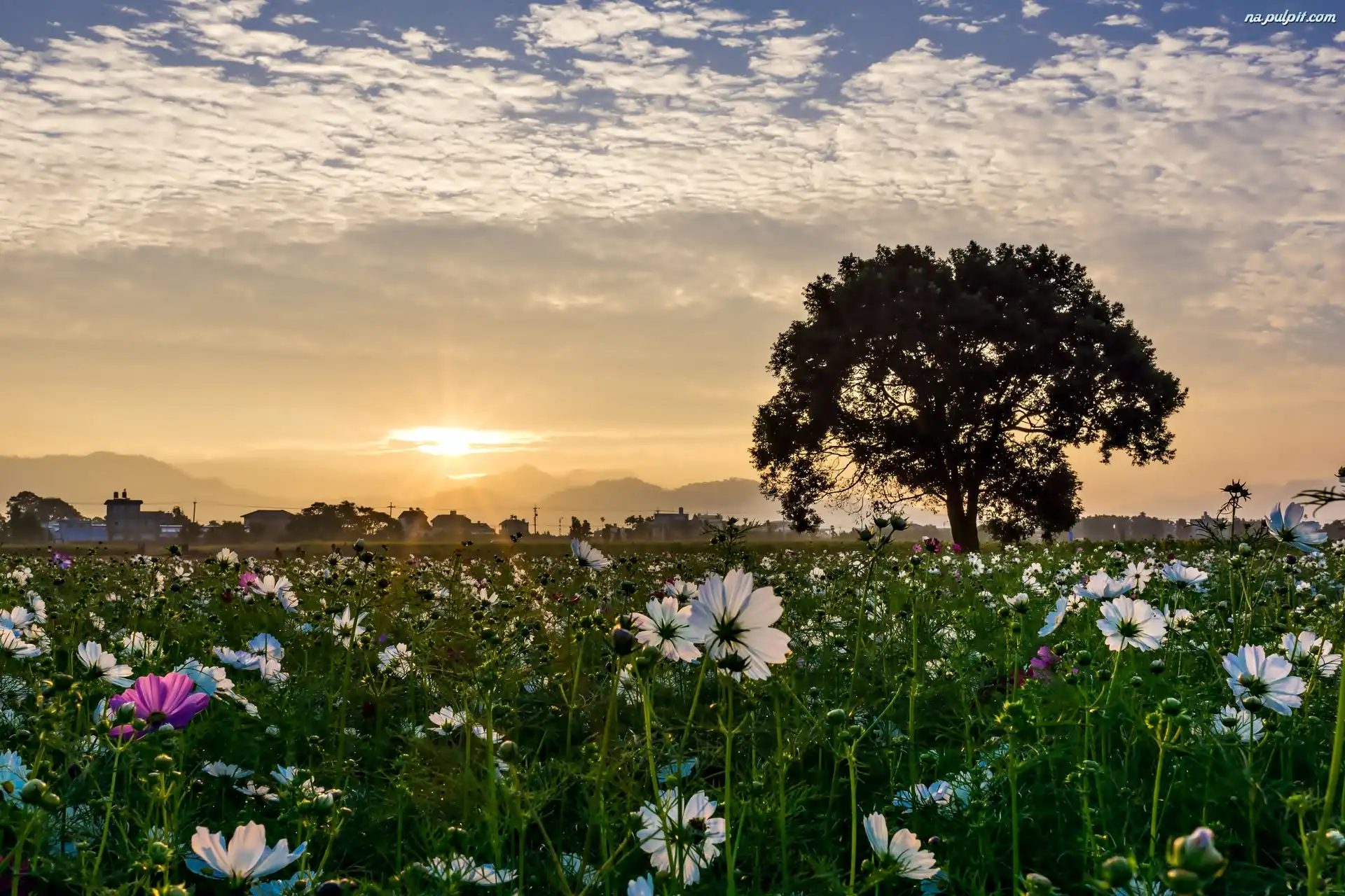 Zachód Słońca, Kwiaty, Pole, Drzewo