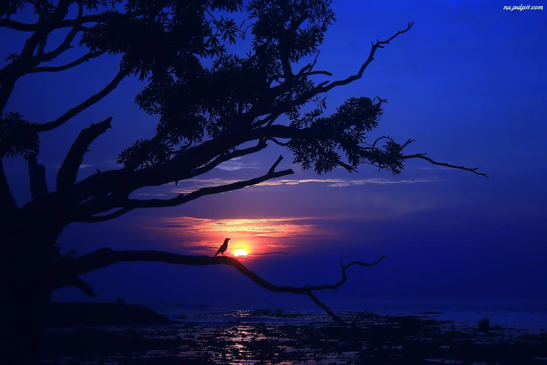 Zachód Słońca, Niebo, Drzewo, Ptak, Morze