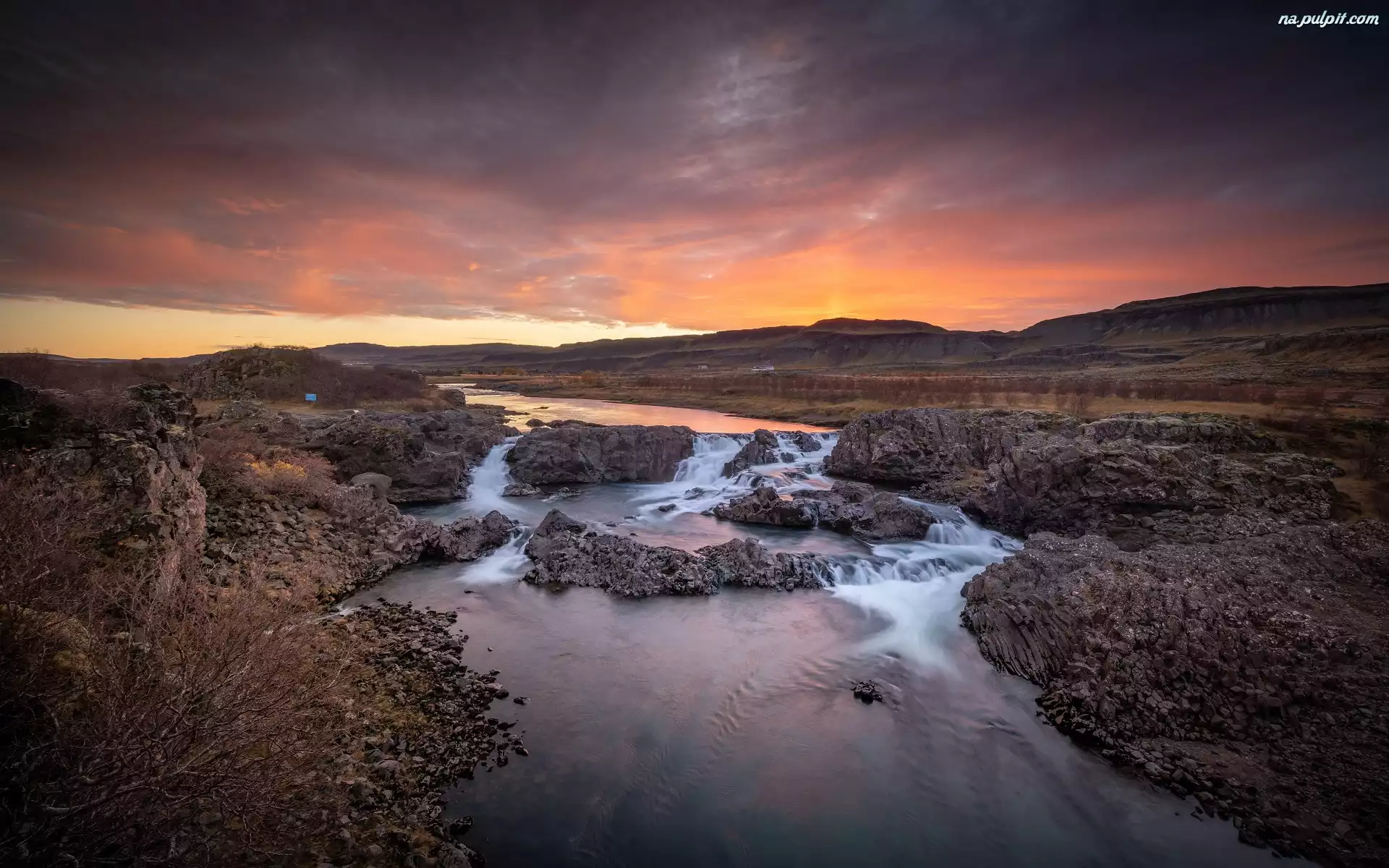 Zachód słońca, Kamienie, Skały, Rzeka, Krzewy Na Pulpit