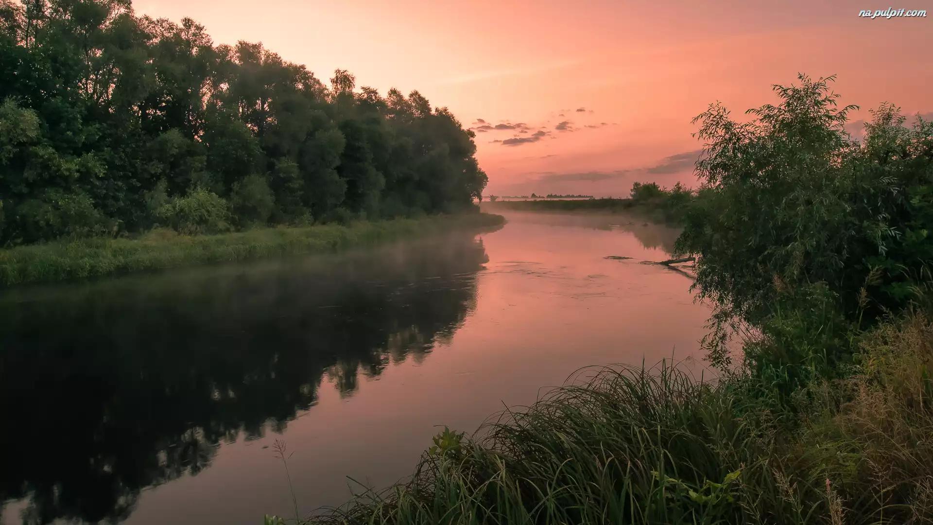 Zachód słońca, Trawa, Drzewa, Rzeka, Krzewy Na Pulpit