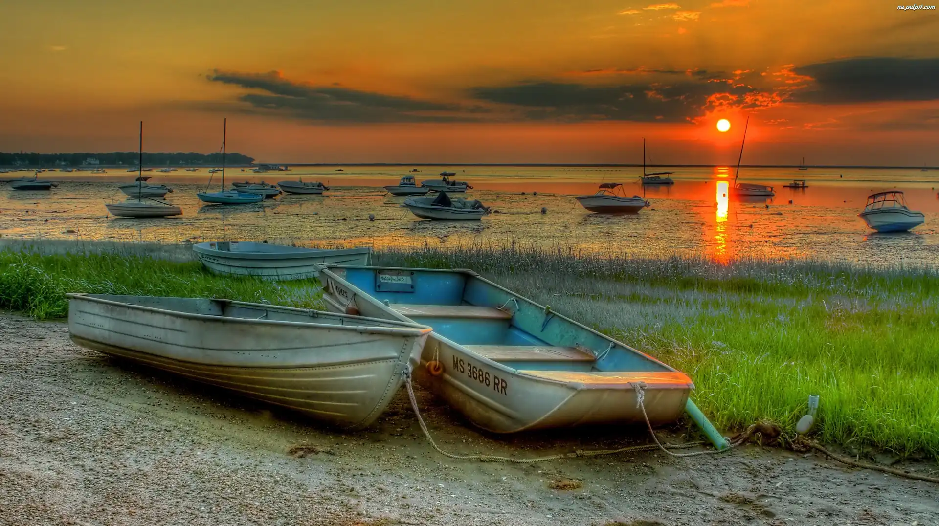 Łódki, Słońca, Zachód, Morze