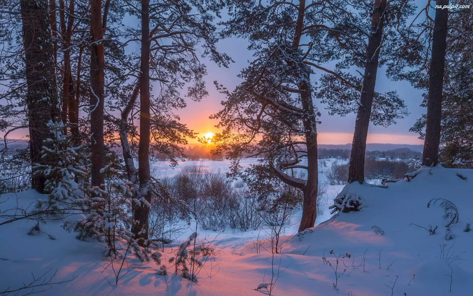 Drzewa, Zima, Śnieg, Zachód słońca, Słońce Na Pulpit