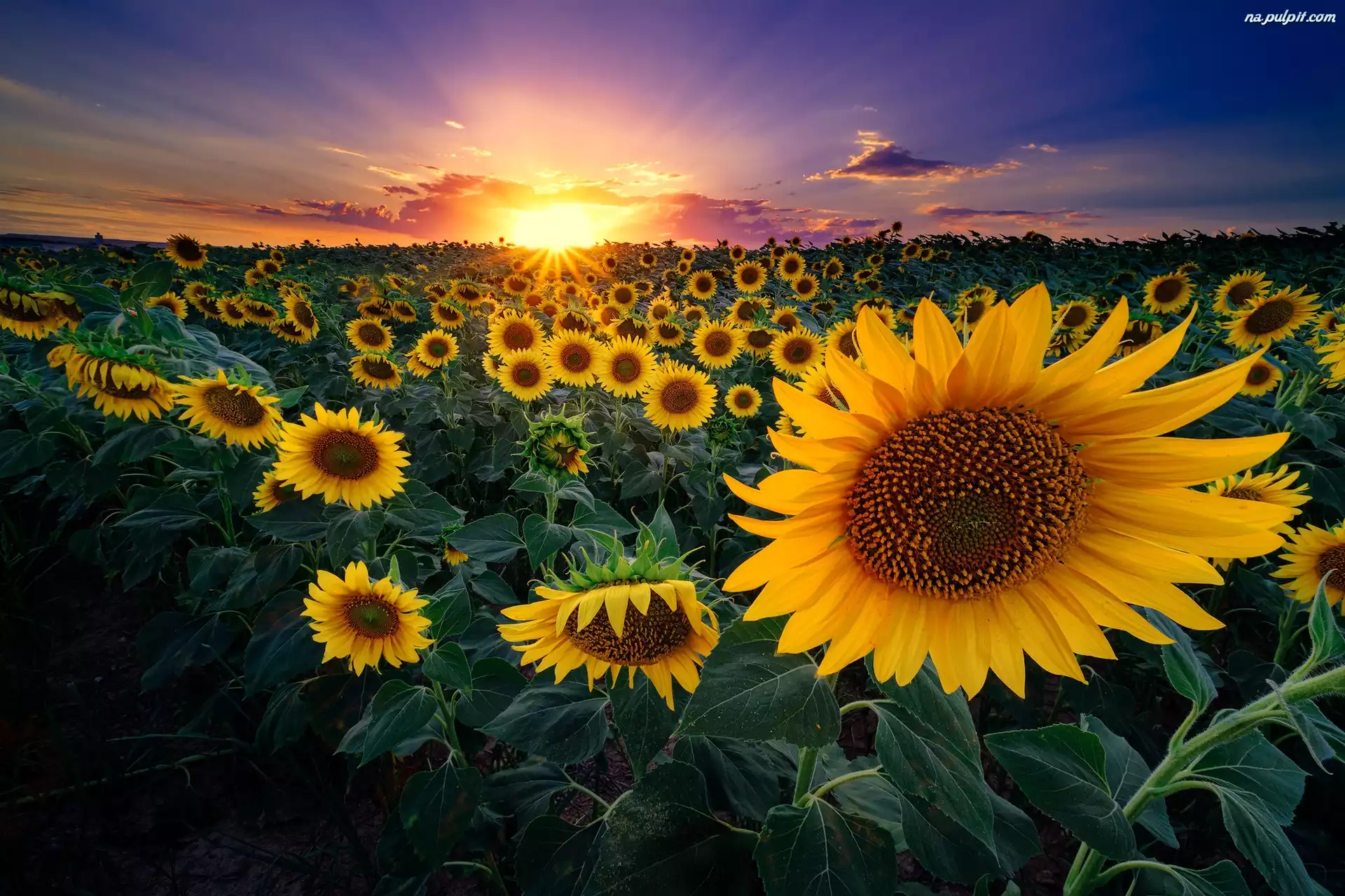 Niebo, Pole, Kwiaty, Zachód słońca, Słoneczniki Na Pulpit
