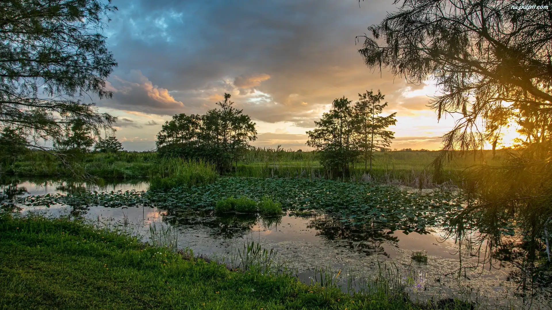 Rośliny, Staw, Drzewa, Zachód słońca, Trawa Na Pulpit