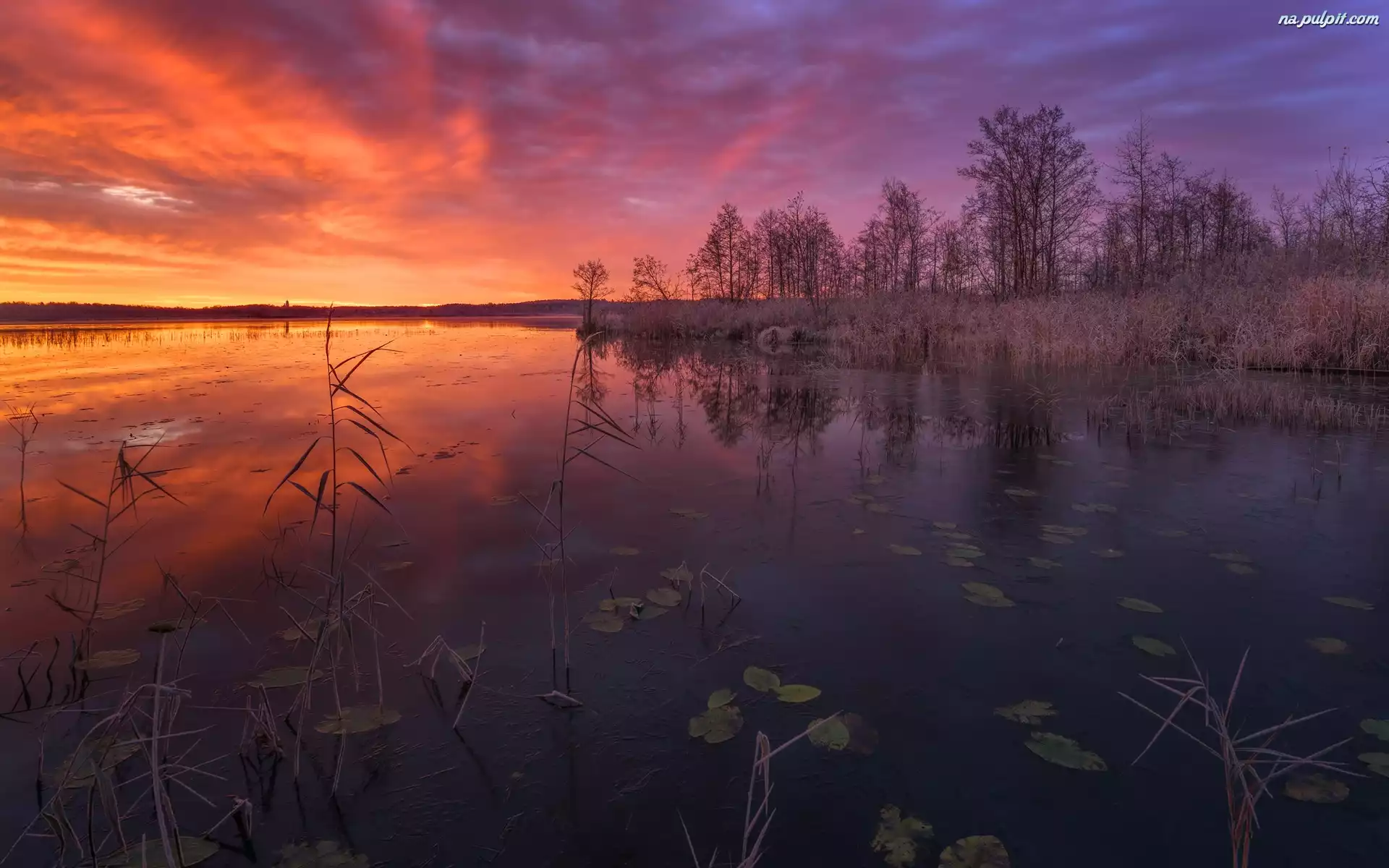 Szuwary, Jezioro, Drzewa, Zachód słońca, Trawa