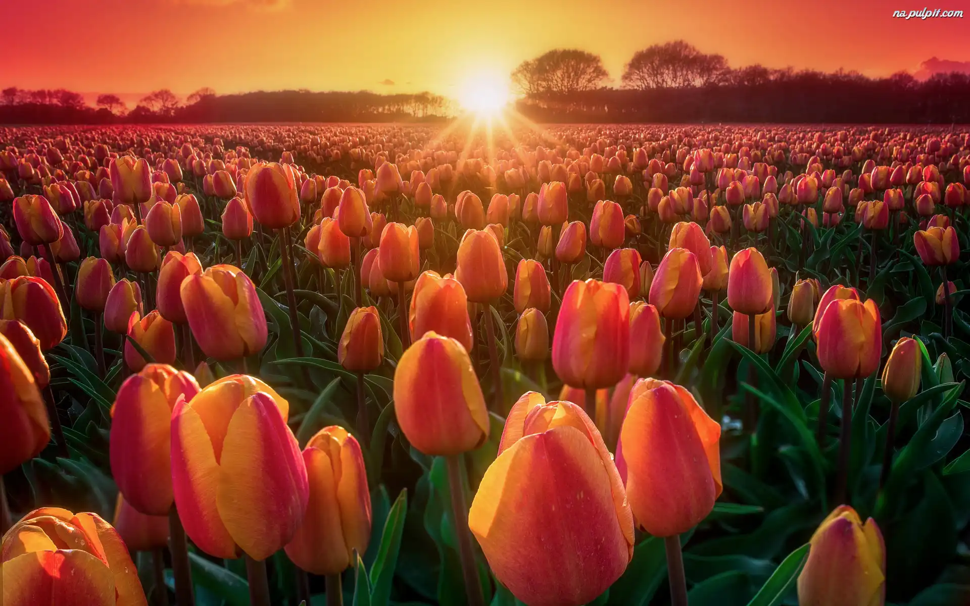 Tulipany, Zachód słońca, Drzewa, Pole, Kolorowe, Plantacja Na Pulpit