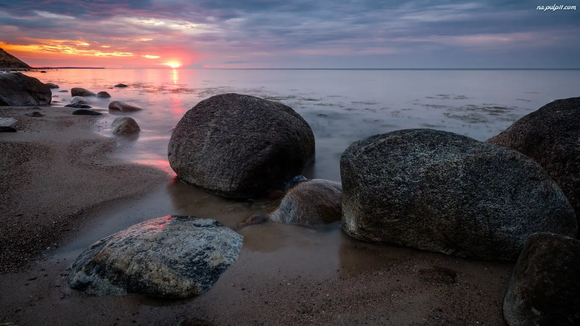 Zachód słońca, Piasek, Kamienie, Wybrzeże, Morze Na Pulpit