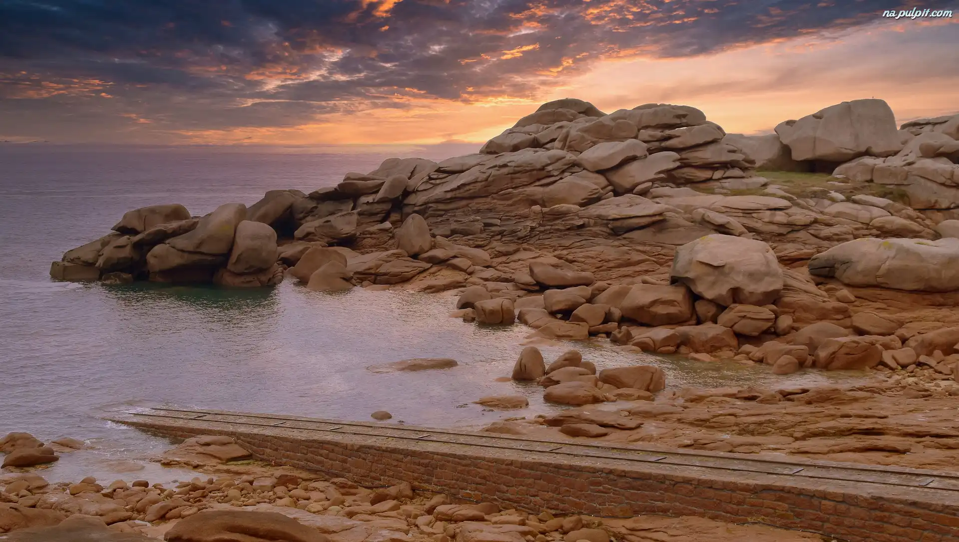Chmury, Morze, Skały, Zachód słońca, Wybrzeże Na Pulpit