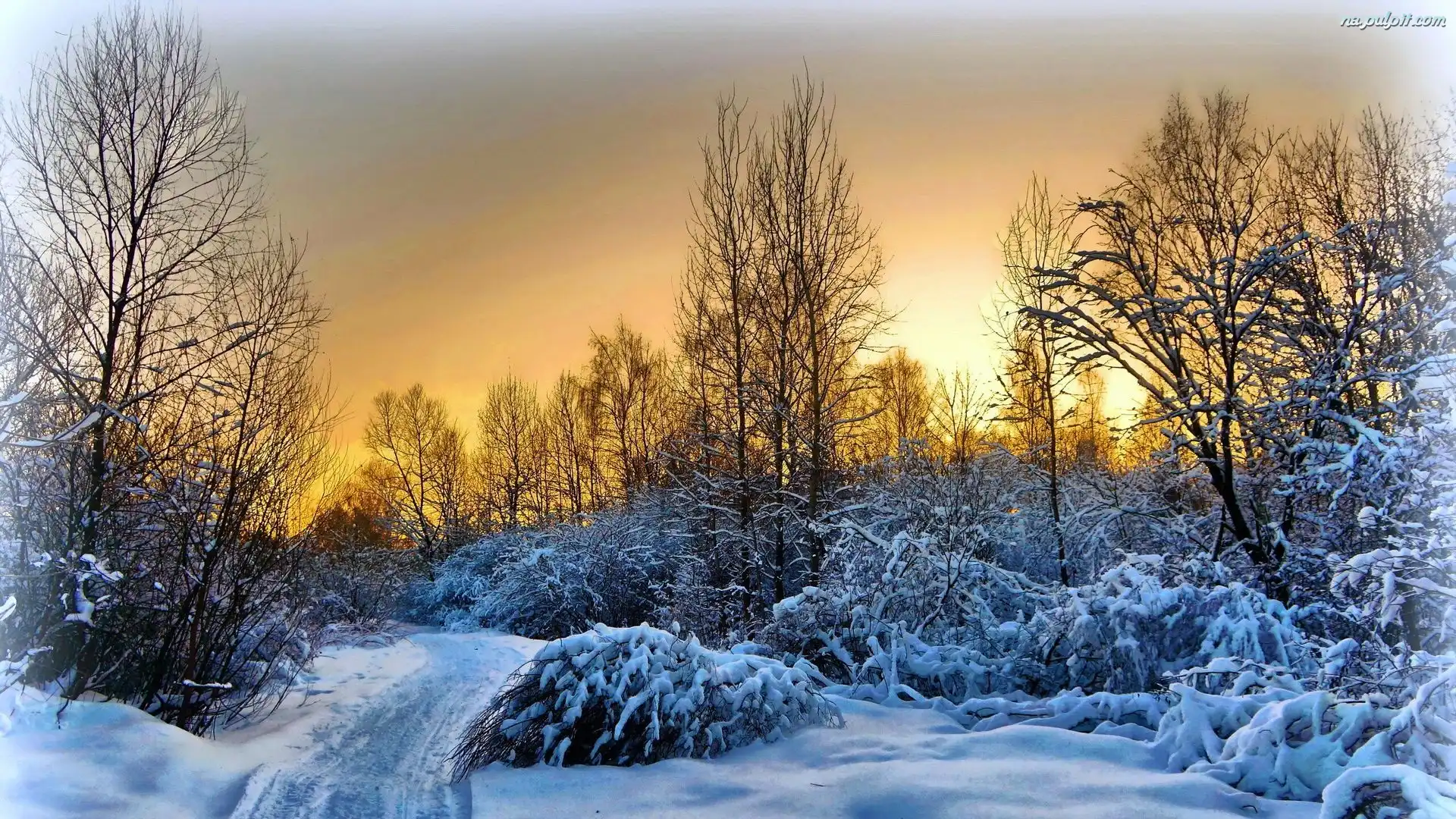 Zachód Słońca, Droga, Zima, Las Na Pulpit