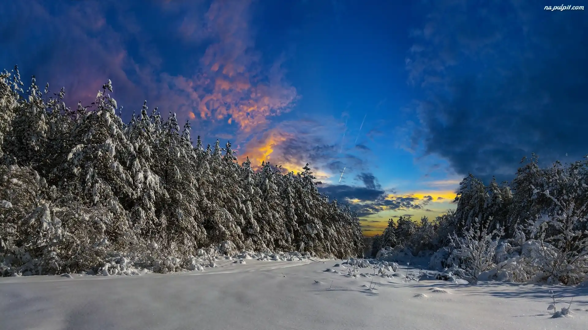 Zachód słońca, Drzewa, Zima, Śnieg Na Pulpit