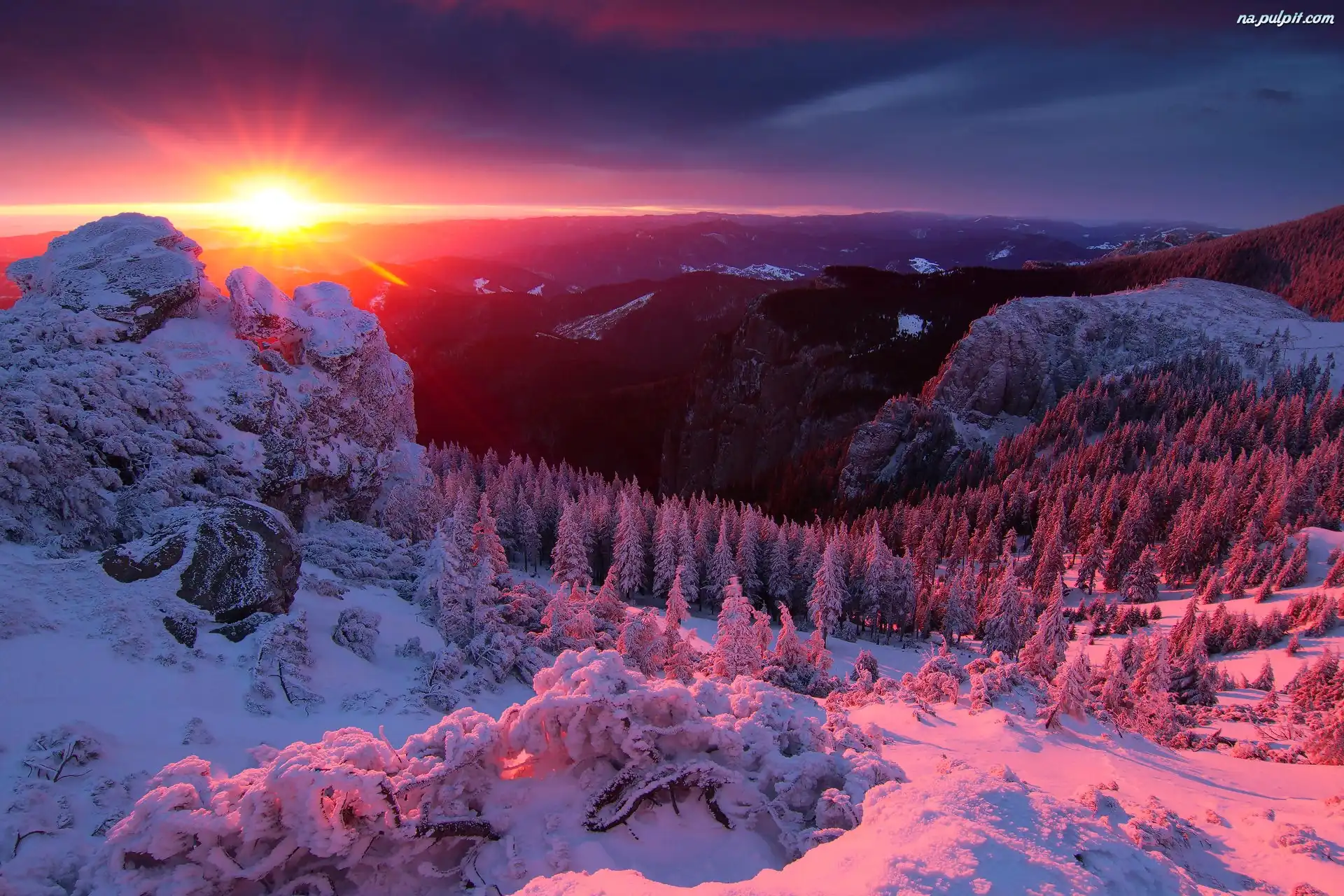 Zachód słońca, Góry, Zima, Las Na Pulpit