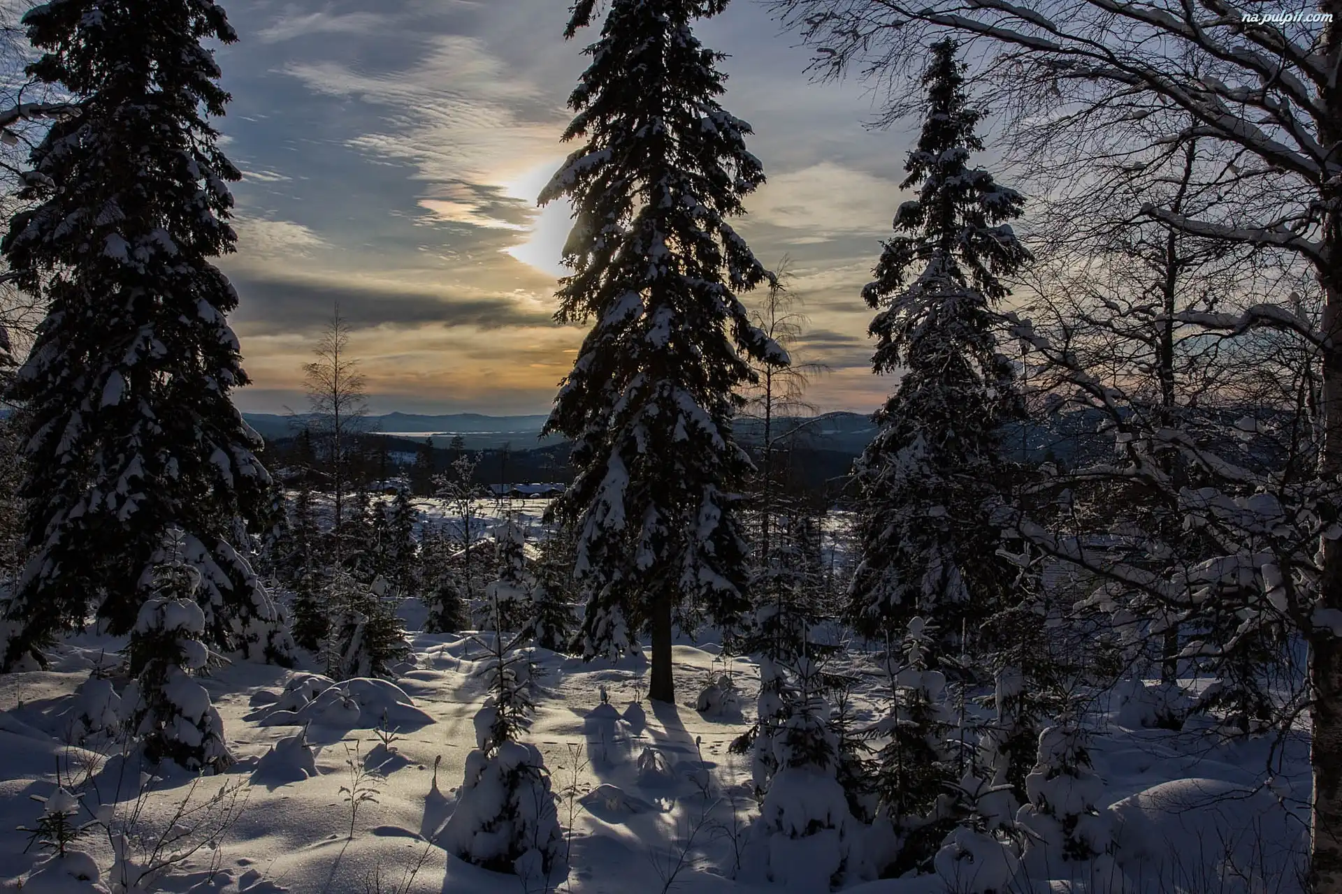 Zachód Słońca, Las, Zima, Góry Na Pulpit