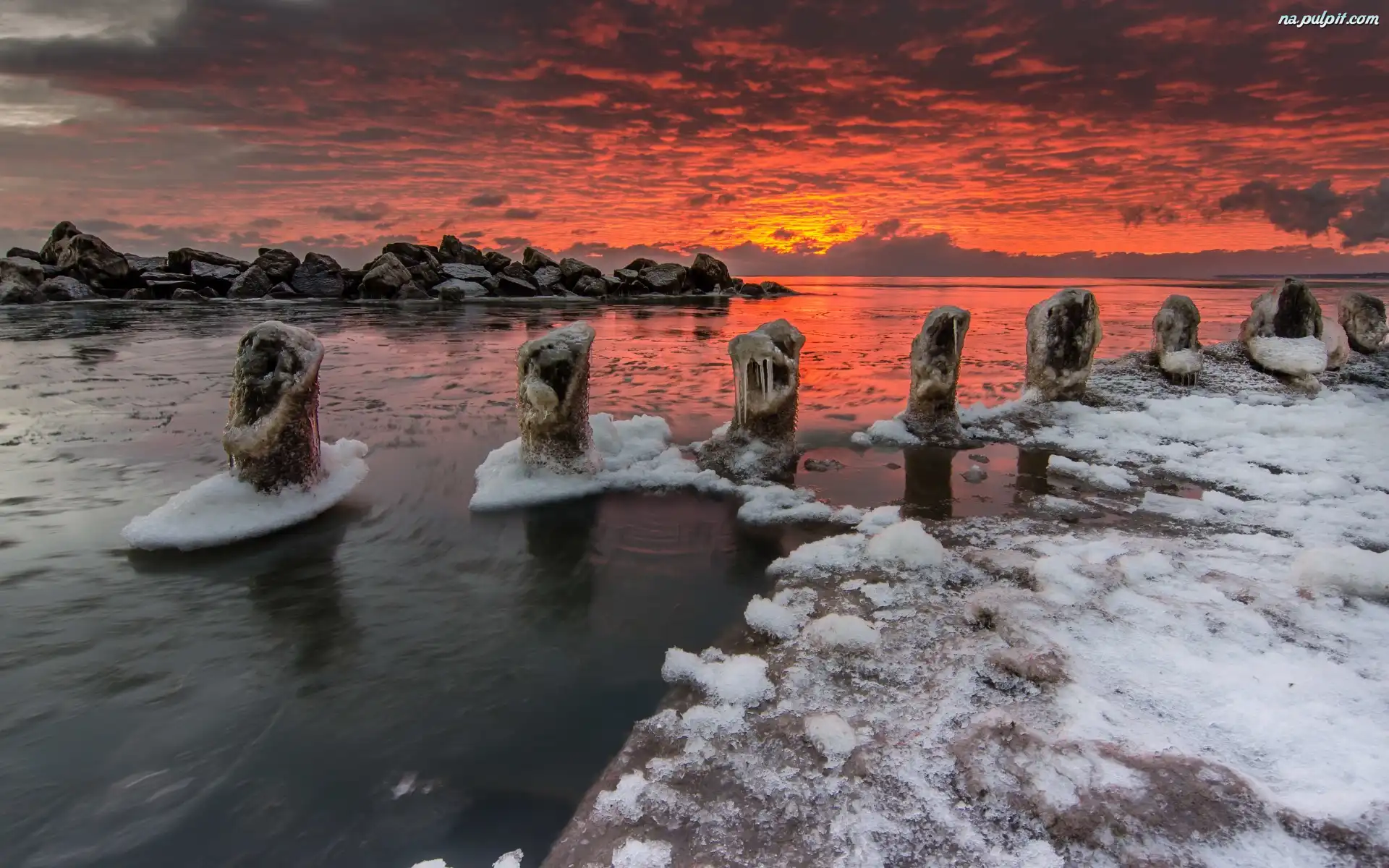 Zachód słońca, Morze, Zima, Skały Na Pulpit