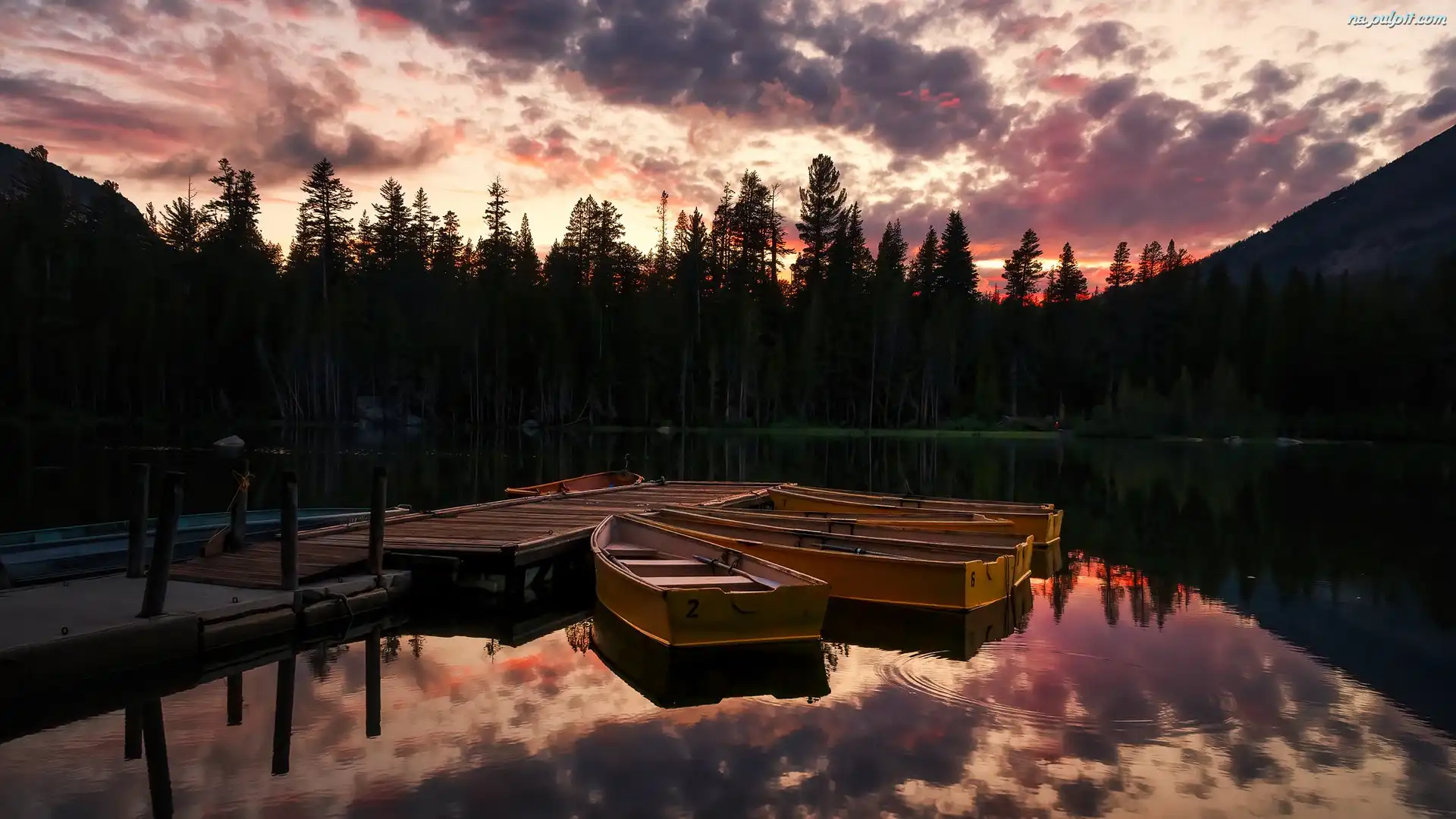 Odbicie, Mammoth Lakes, Zachód słońca, Kalifornia, Drzewa, Pomost, Stany Zjednoczone, Wzgórza, Jezioro, Łódki Na Pulpit |