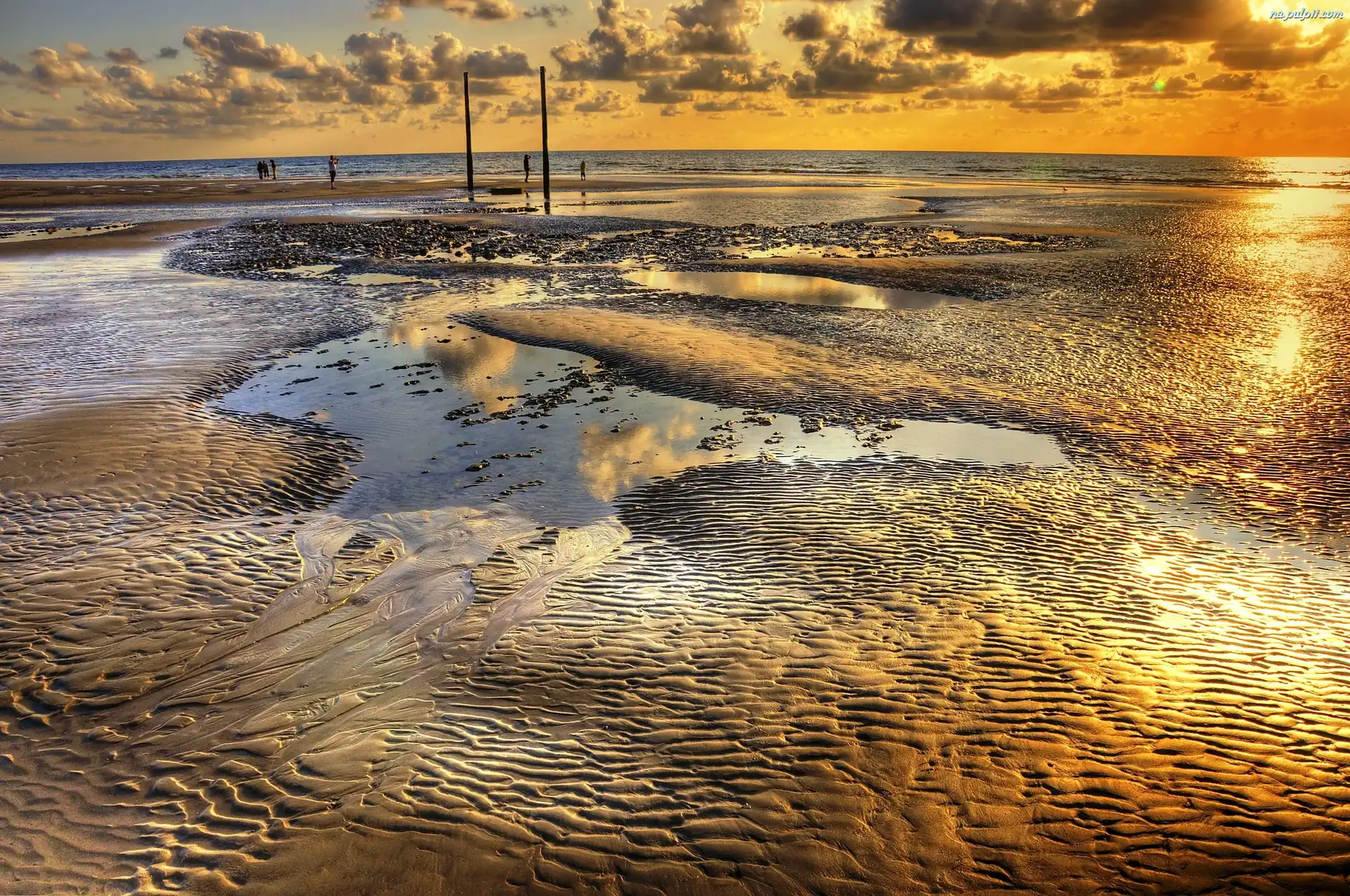 Zalana, Słońca, Chmury, Plaża, Morze, Zachód