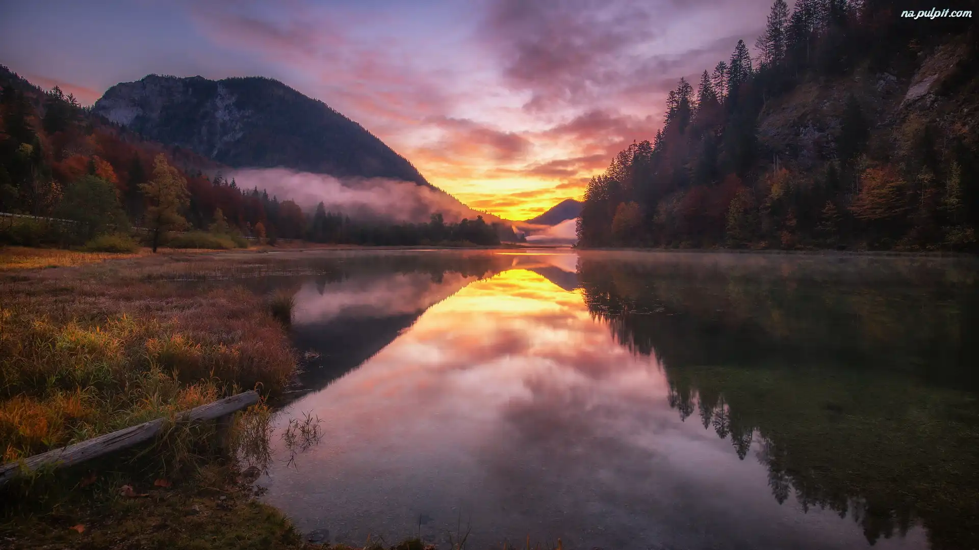 Góry, Zalesione, Wzgórza, Mgła, Jezioro, Zachód słońca Na Pulpit