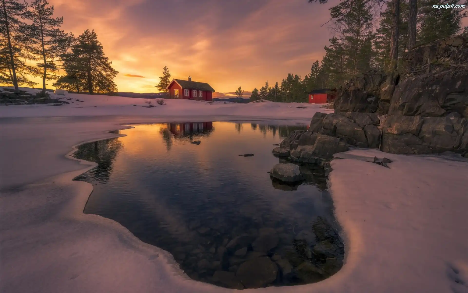 Zamarznięte, Drzewa, Kamienie, Jezioro, Zima, Domki Na Pulpit