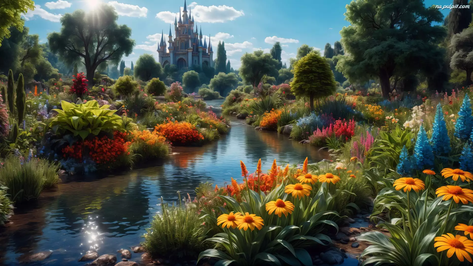 Grafika, Rzeka, Drzewa, Zamek, Ogród, Kwiaty, Chmury Na Pulpit