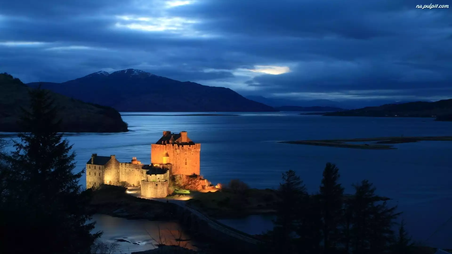 Zamek, Góry, Jezioro, Oświetlony