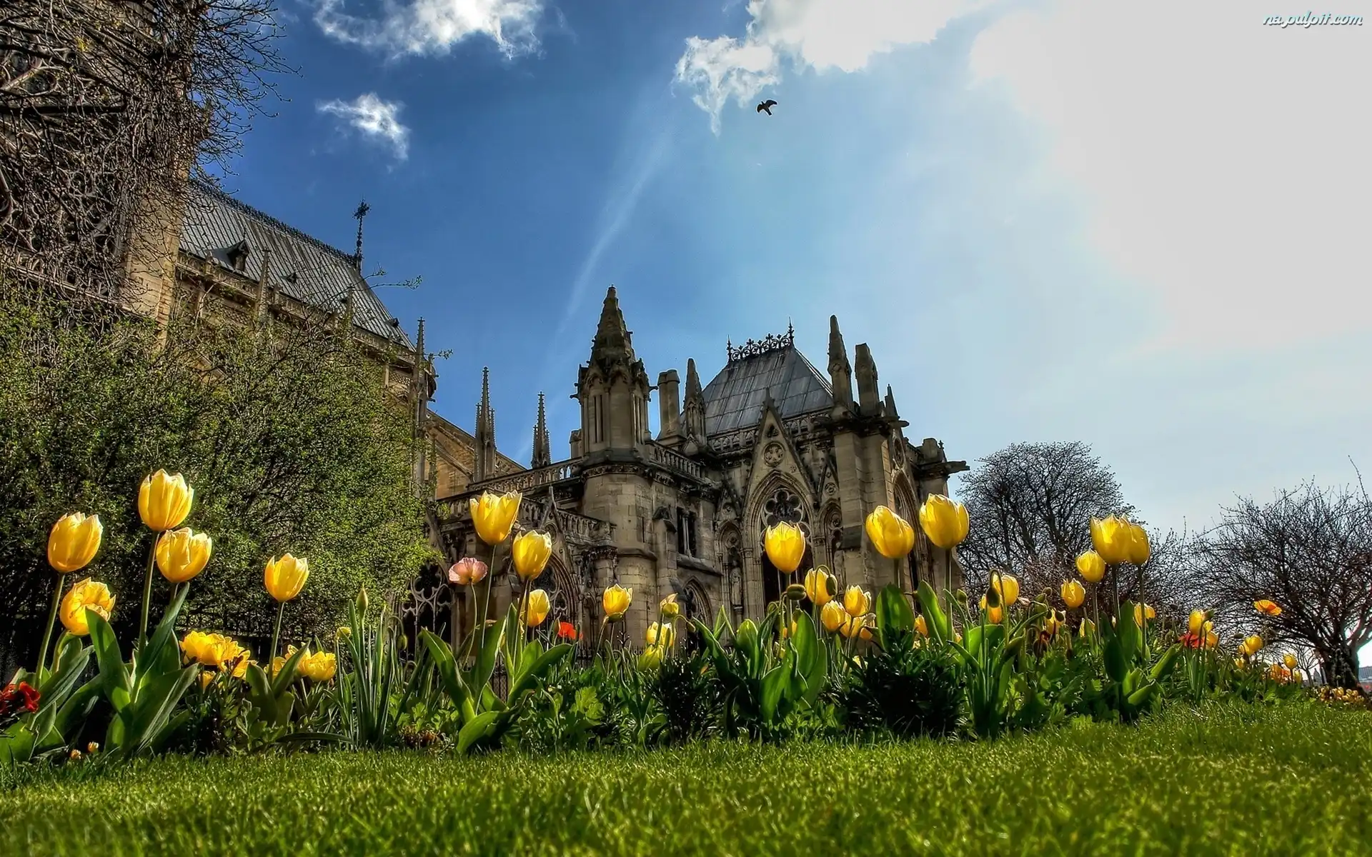 Zamek, Niebo, Ptak, Tulipany, Stary, Drzewa