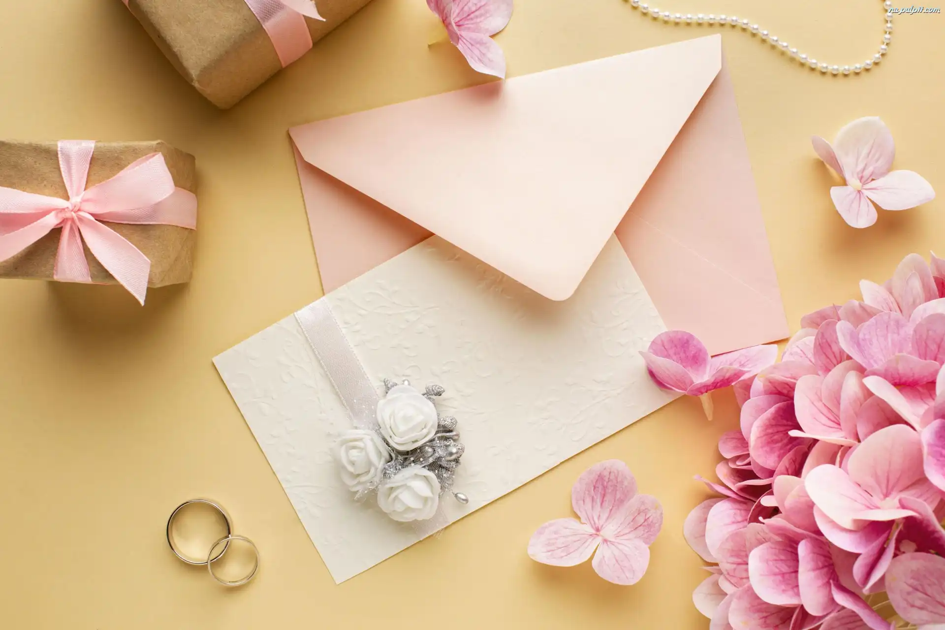 Różowe, Zaproszenie, Koperta, Kwiaty, Hortensja, Prezenty, Ślub, Obrączki