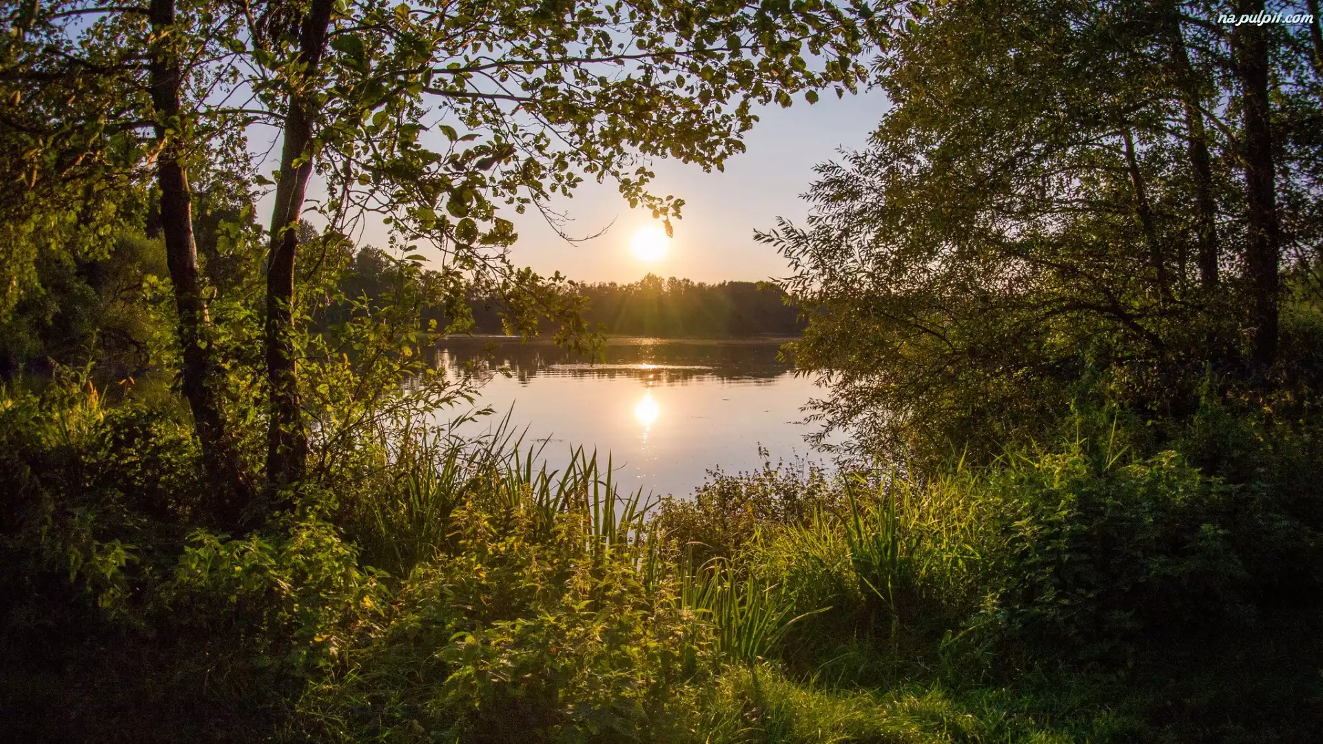 Niebo, Las, Jezioro, Zarośla, Drzewa, Promienie słońca Na Pulpit
