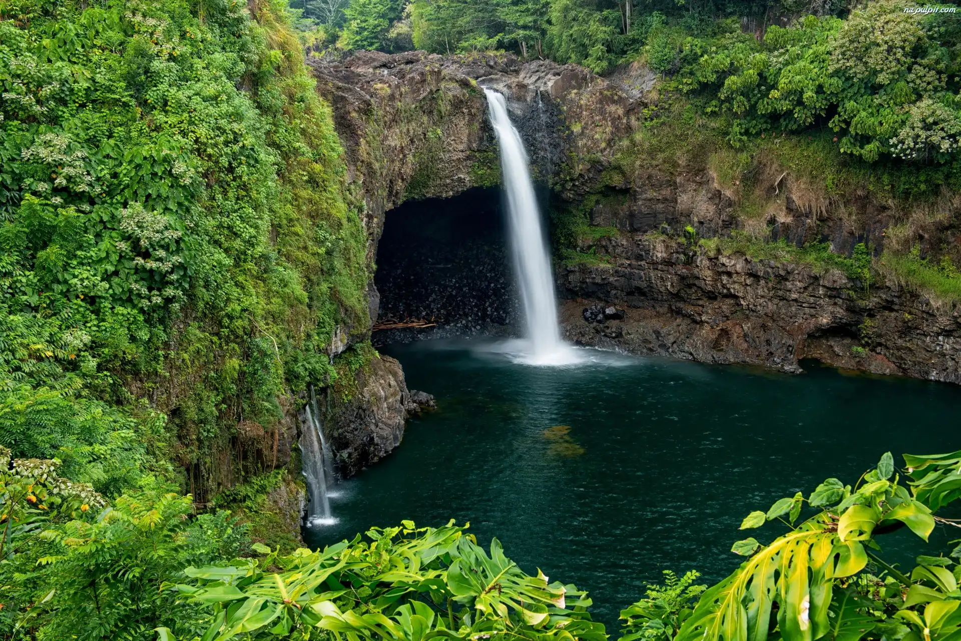 Rzeka, Wodospad Rainbow, Rośliny, Skały, Park Wailuku River, Hawaje, Zarośla Na Pulpit