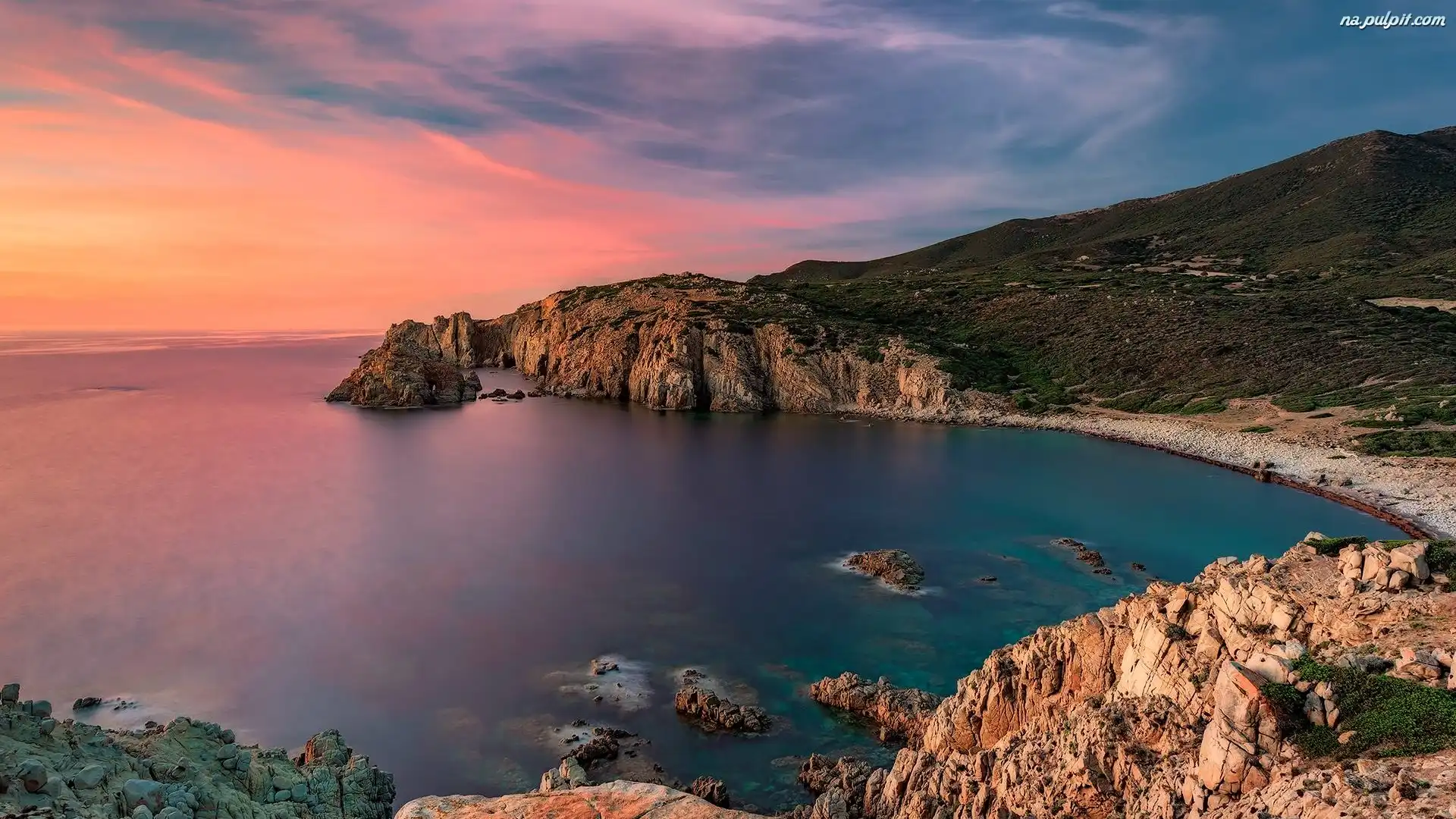 Wybrzeże, Zaróżowione, Niebo, Skały, Morze, Wschód słońca Na Pulpit