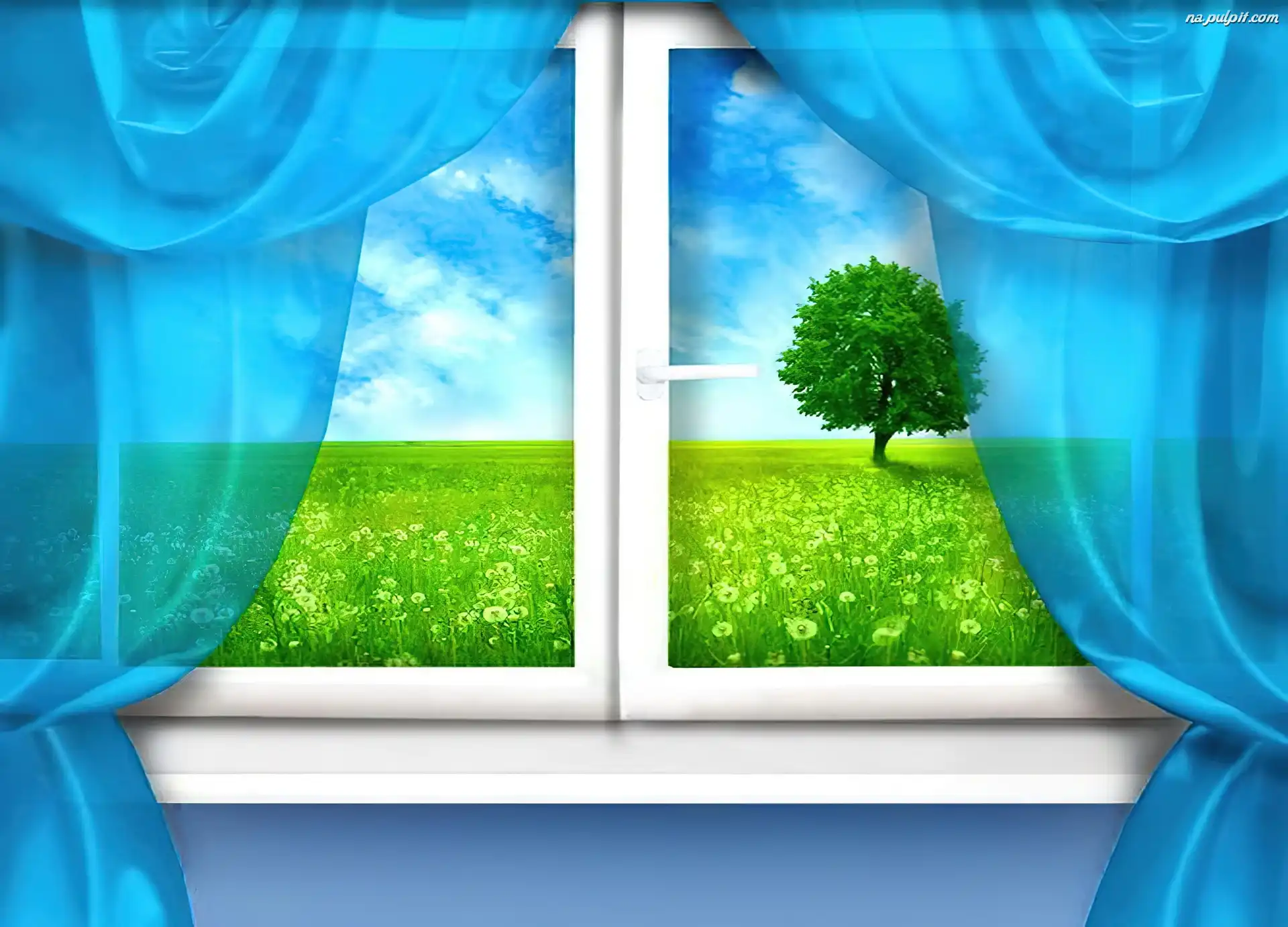 Zasłony, Drzewo, Łąka, Okno, Niebieskie Na Pulpit