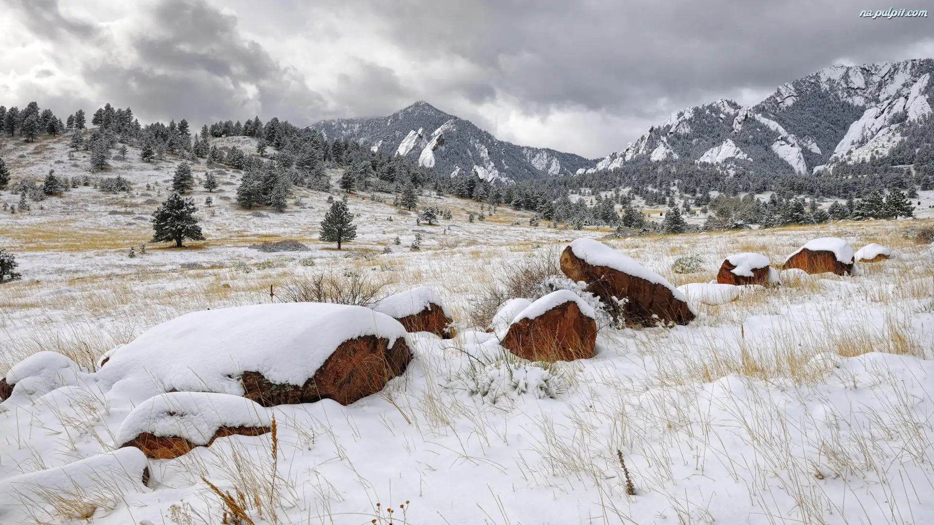 Kamienie, Góry, Jezioro Oszronione, Drzewa Zima, Drzewo Jezioro, Góry, Chmurki Plaża, Fale, Góry, Morze Góra Góra Zima, Rzeka Góra Góry, Krzewy palmy, Chmura, Góry, Niebo Góry, śnieg domki, Góry, dwa drzewa skały, Niebo