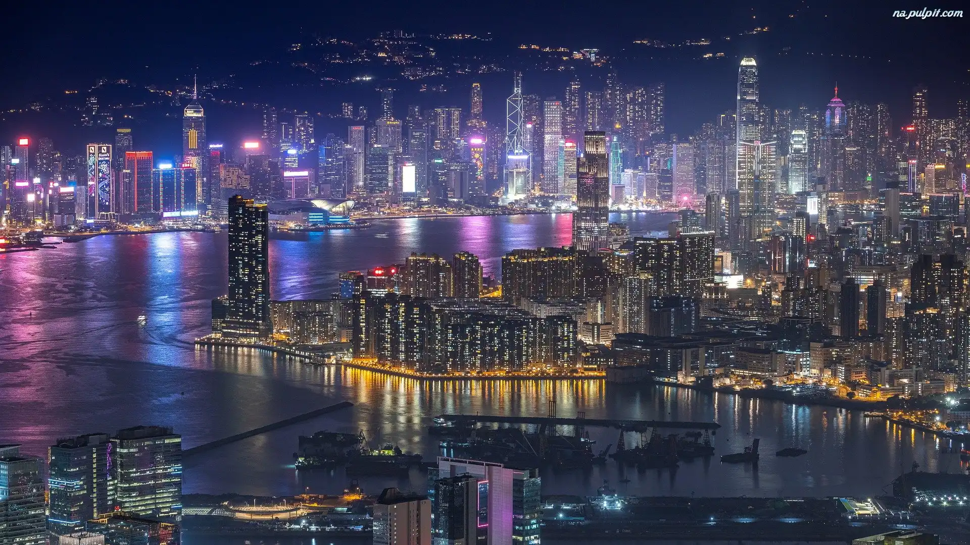 Rzeka Perłowa, Miasto nocą, Wieżowce, Zatoka, Hongkong, Chiny, Port, Noc, Victoria Harbour Na Pulpit |