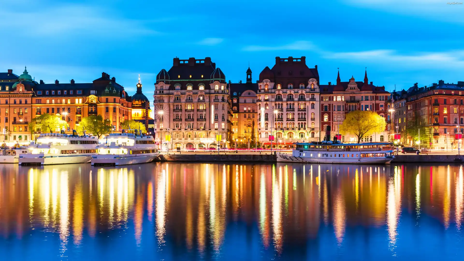 Statki pasażerskie, Sztokholm, Domy, Noc, Gamla stan, Szwecja, Zatoka Na Pulpit
