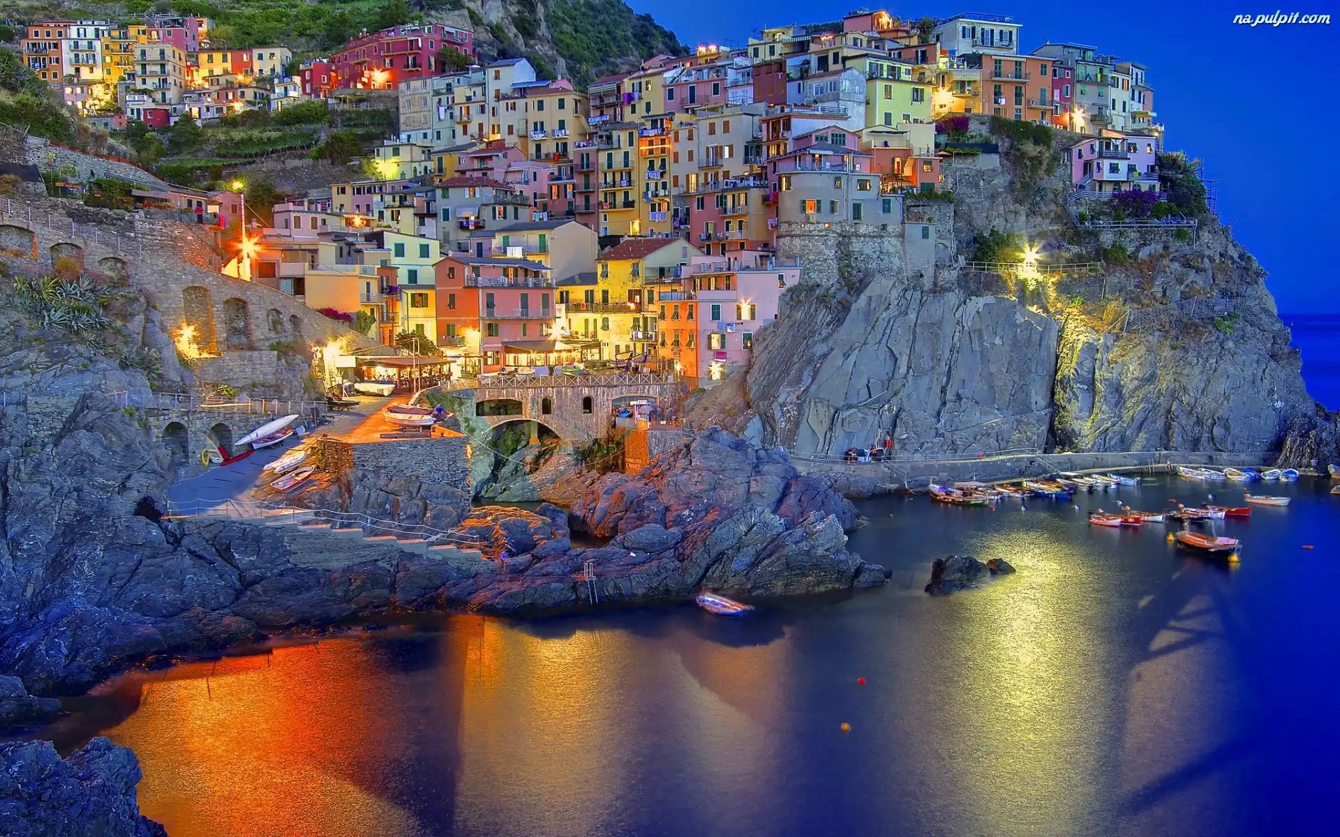 Zmrok, Zatoka, Włochy, Miasteczko, Łodzie, Wybrzeże, Manarola