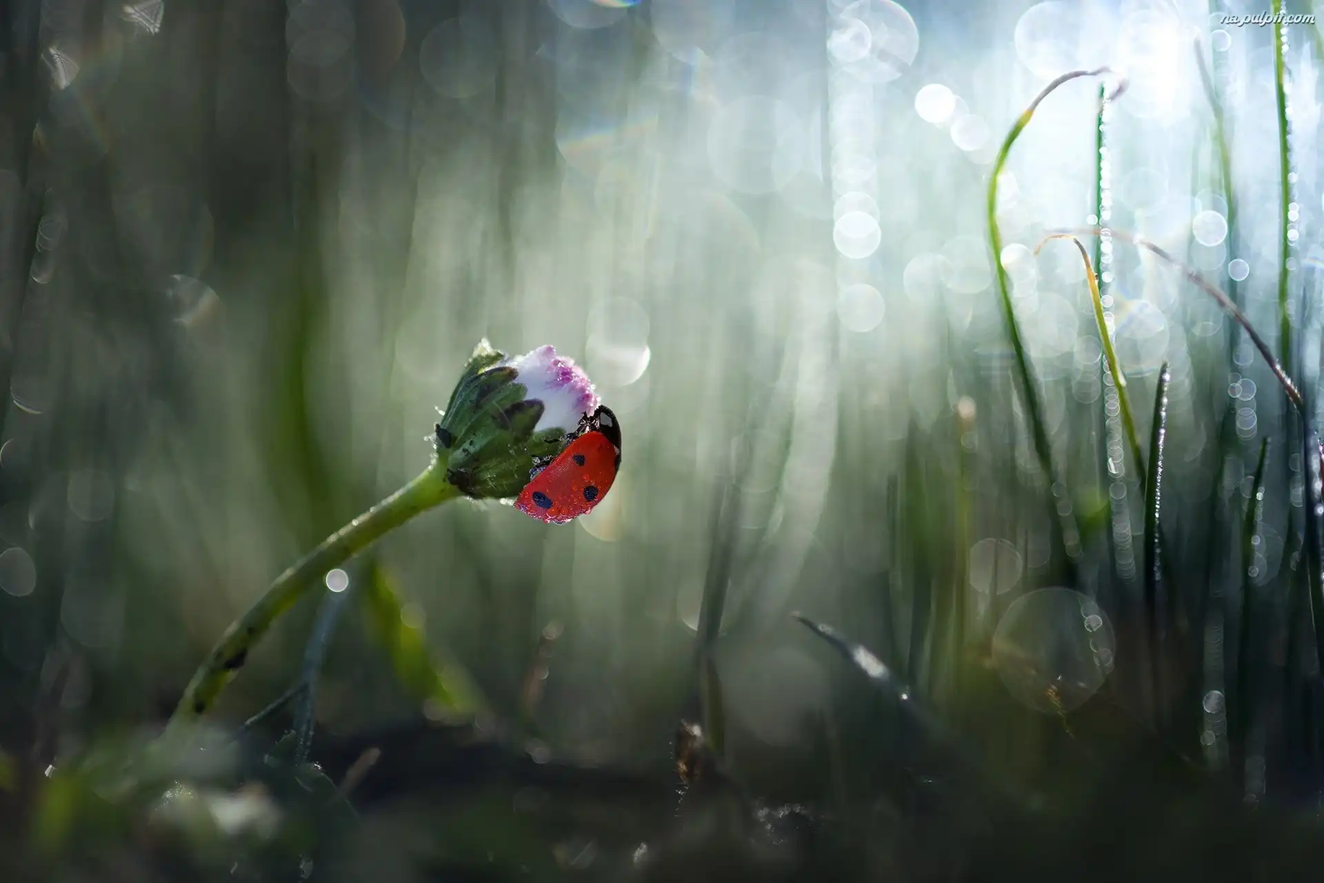 Kwiat, Zbliżenie, Rozmyte tło, Stokrotka, Biedronka, Trawa Na Pulpit