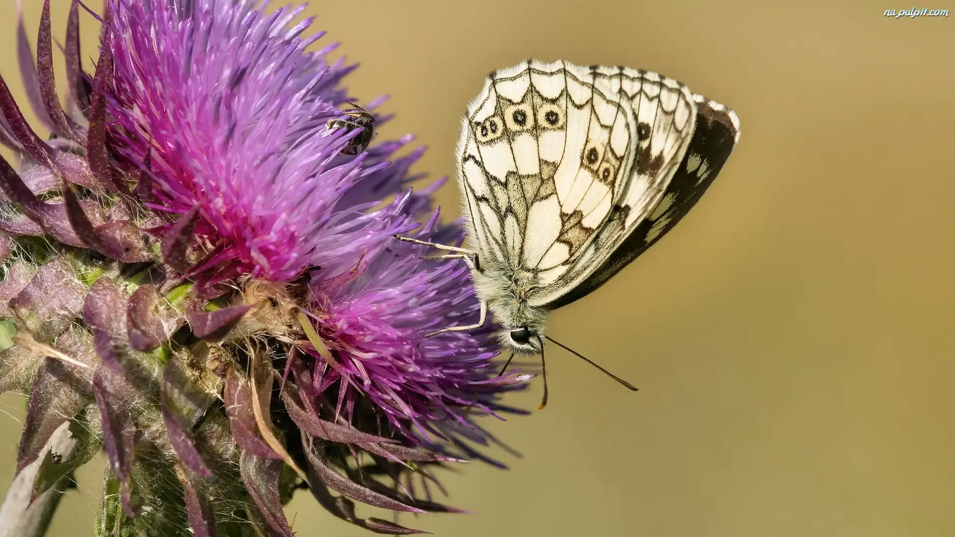 Zbliżenie, Roślina, Polowiec szachownica, Motyl, Oset Na Pulpit