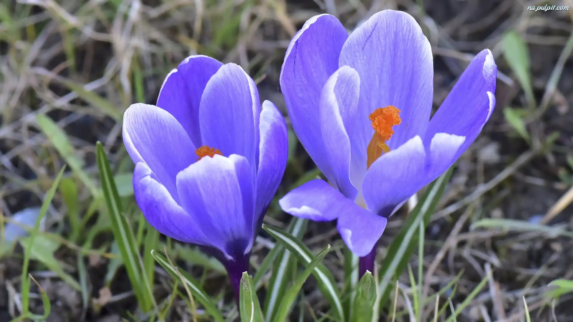 Zbliżenie, Krokusy, Dwa, Niebieskie, Trawa Na Pulpit