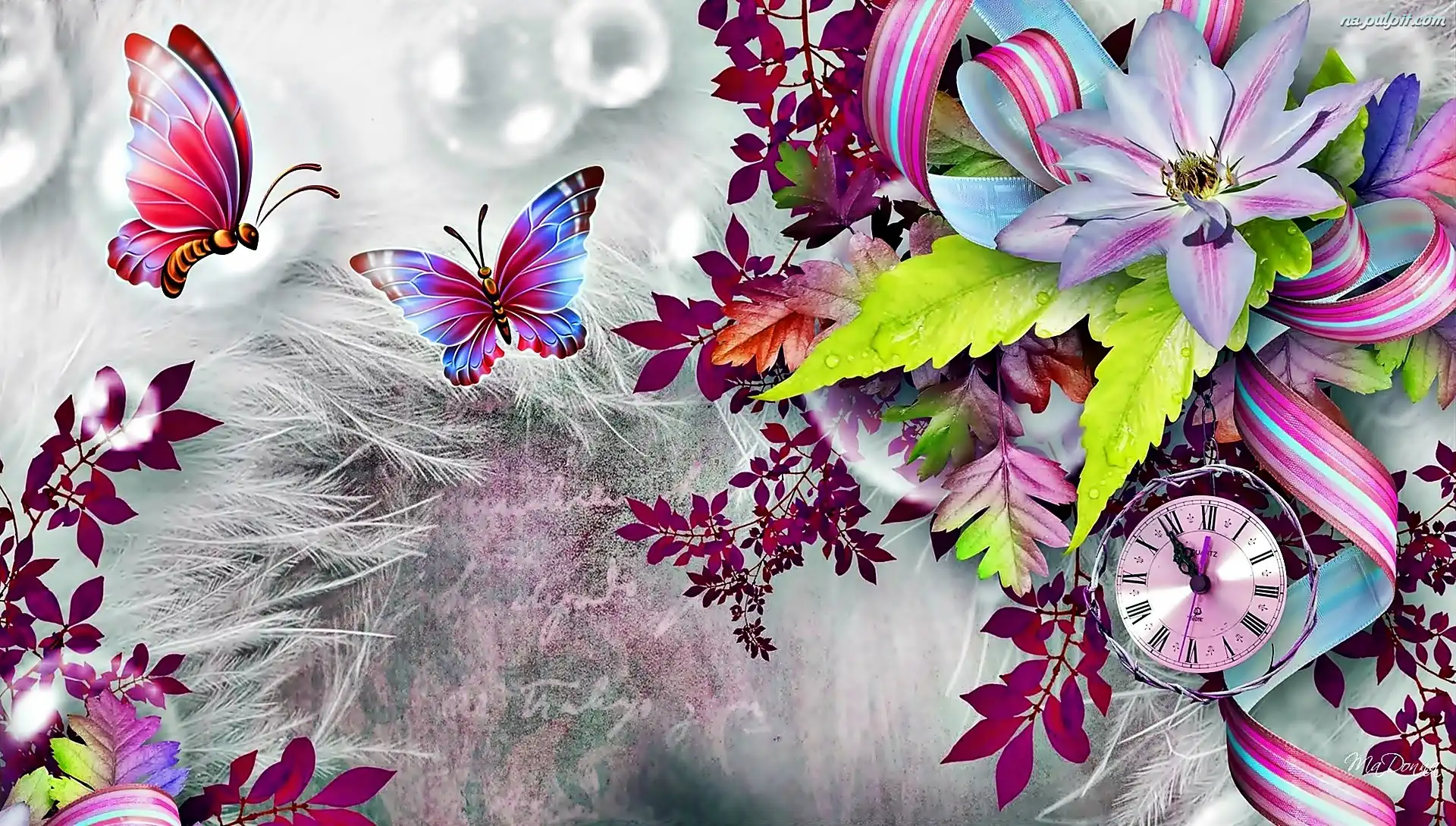 Zegar, Liście, Kwiaty, Motyle Na Pulpit