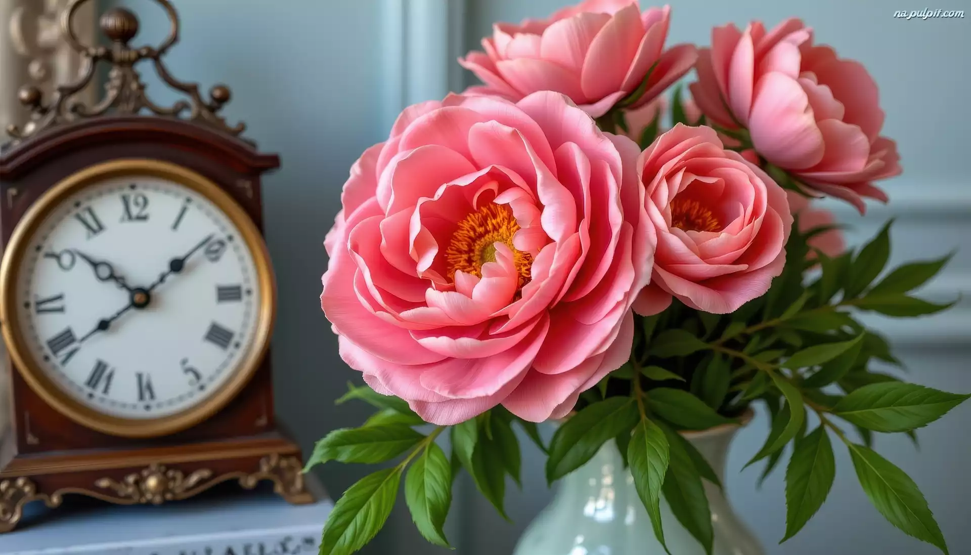 Kwiaty, Piwonie, Różowe, Zegar Na Pulpit