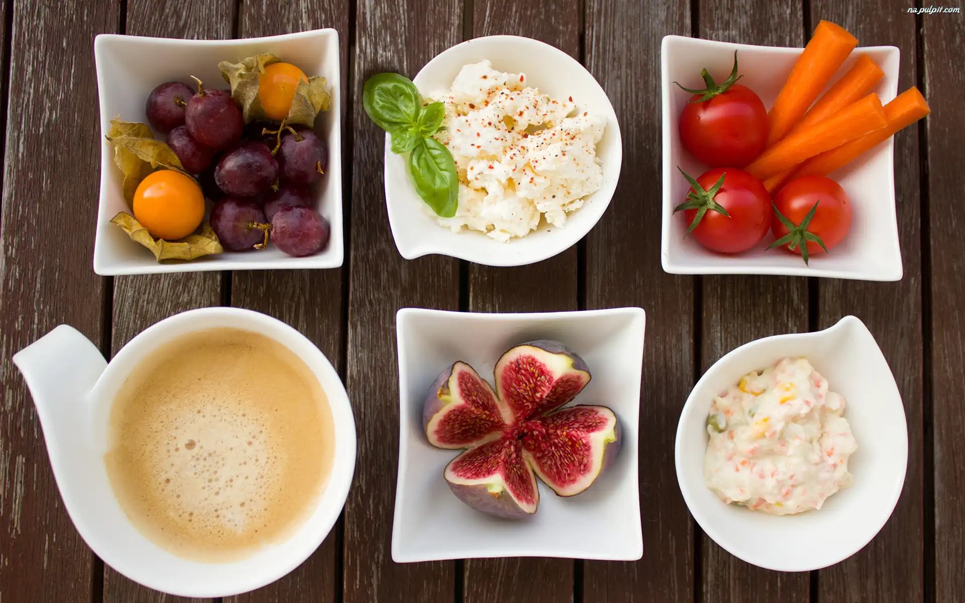 Figa, Marchewka, Zestaw, Winogrona, Miechunka, Miseczki, Deski, Kawa, Pomidory, Jedzenie, Sałatka Na Pulpit |