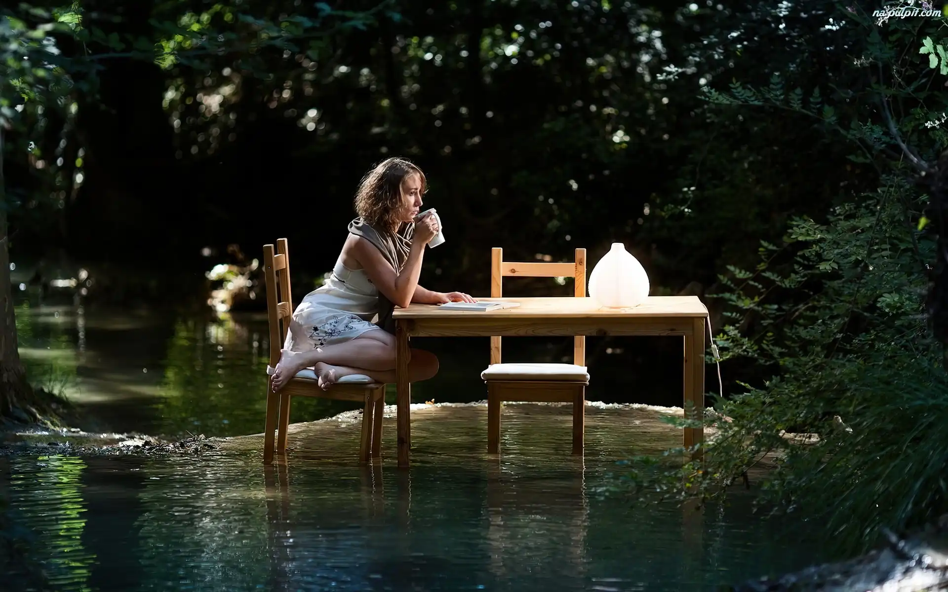 Zieleń, Krzesła, Stół, Kobieta, Woda
