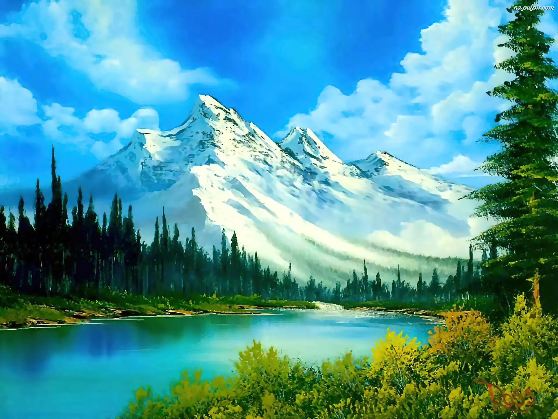 Zieleń, Turkusowa, Góry, Ośnieżone, Rzeka Na Pulpit