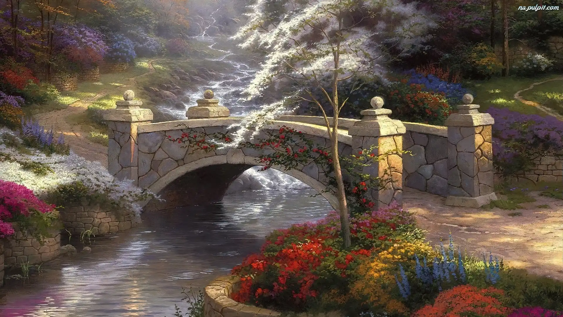 Zieleń, Mostek, Rzeczka, Park, Kwiaty Na Pulpit