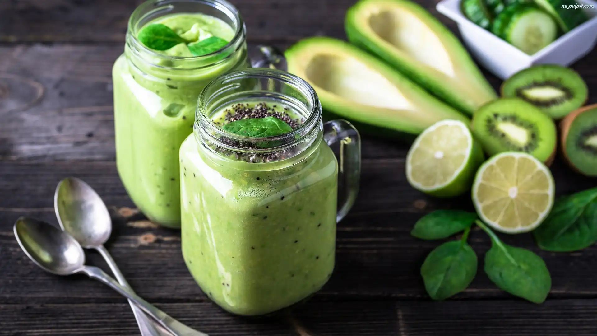 Smoothie, Limonki, Awokado, Słoiki, Owoce, Łyżeczki, Deski, Kiwi, Napój, Zielone Na Pulpit