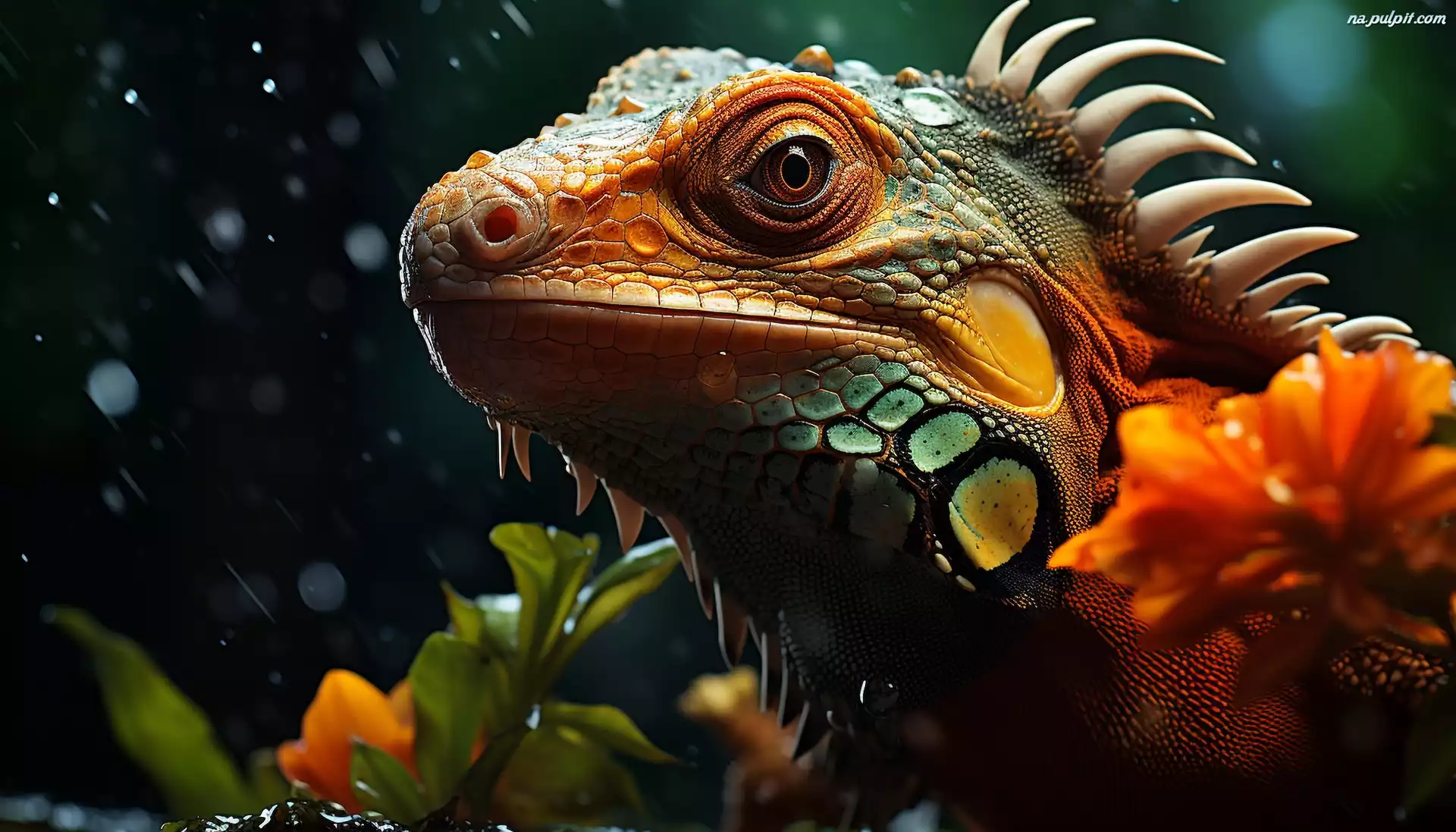 Kwiaty, Jaszczurka, Legwan zielony, Głowa, Zbliżenie Na Pulpit