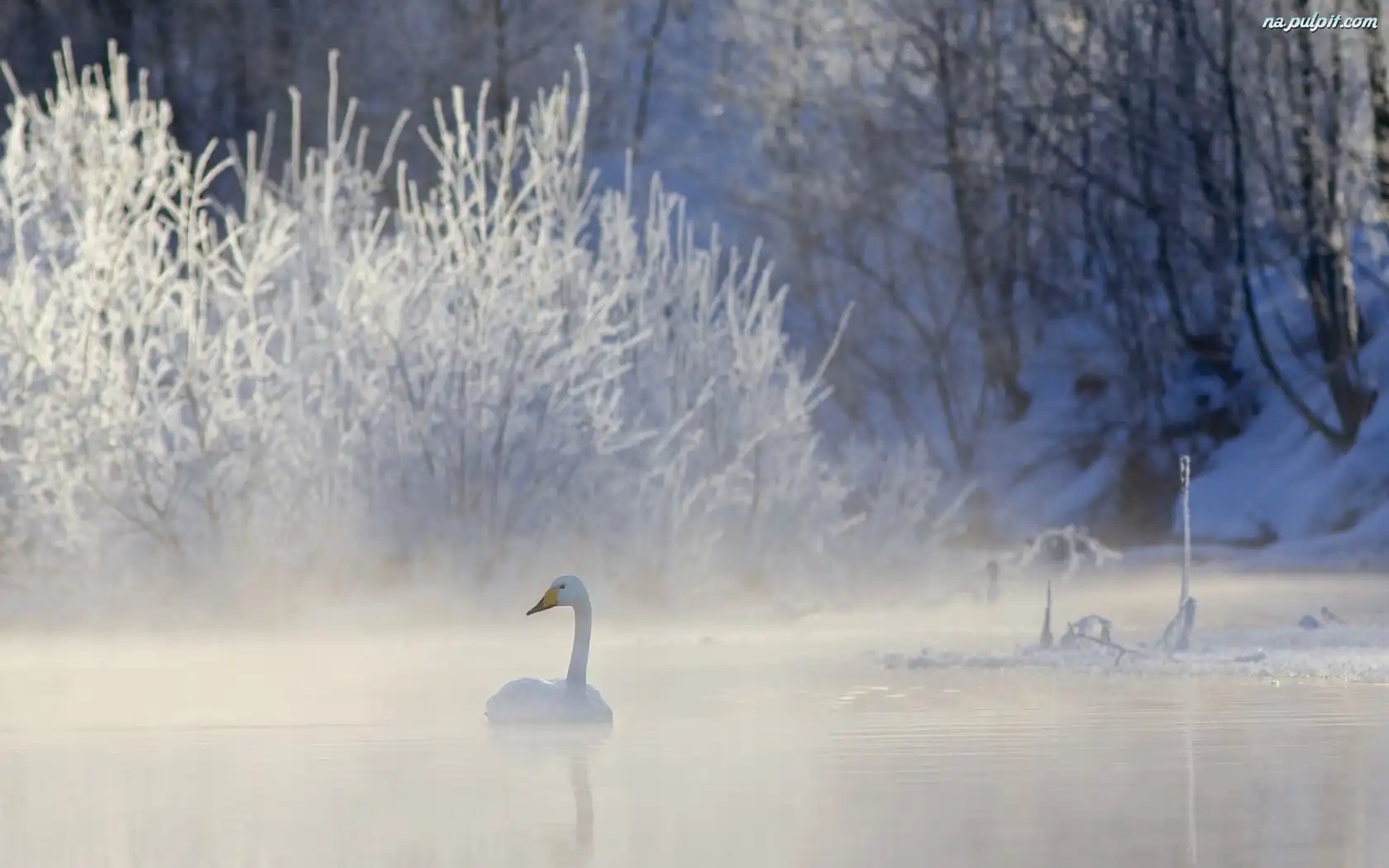 Zima, Mgła, Jezioro, Łabędź, Las Na Pulpit