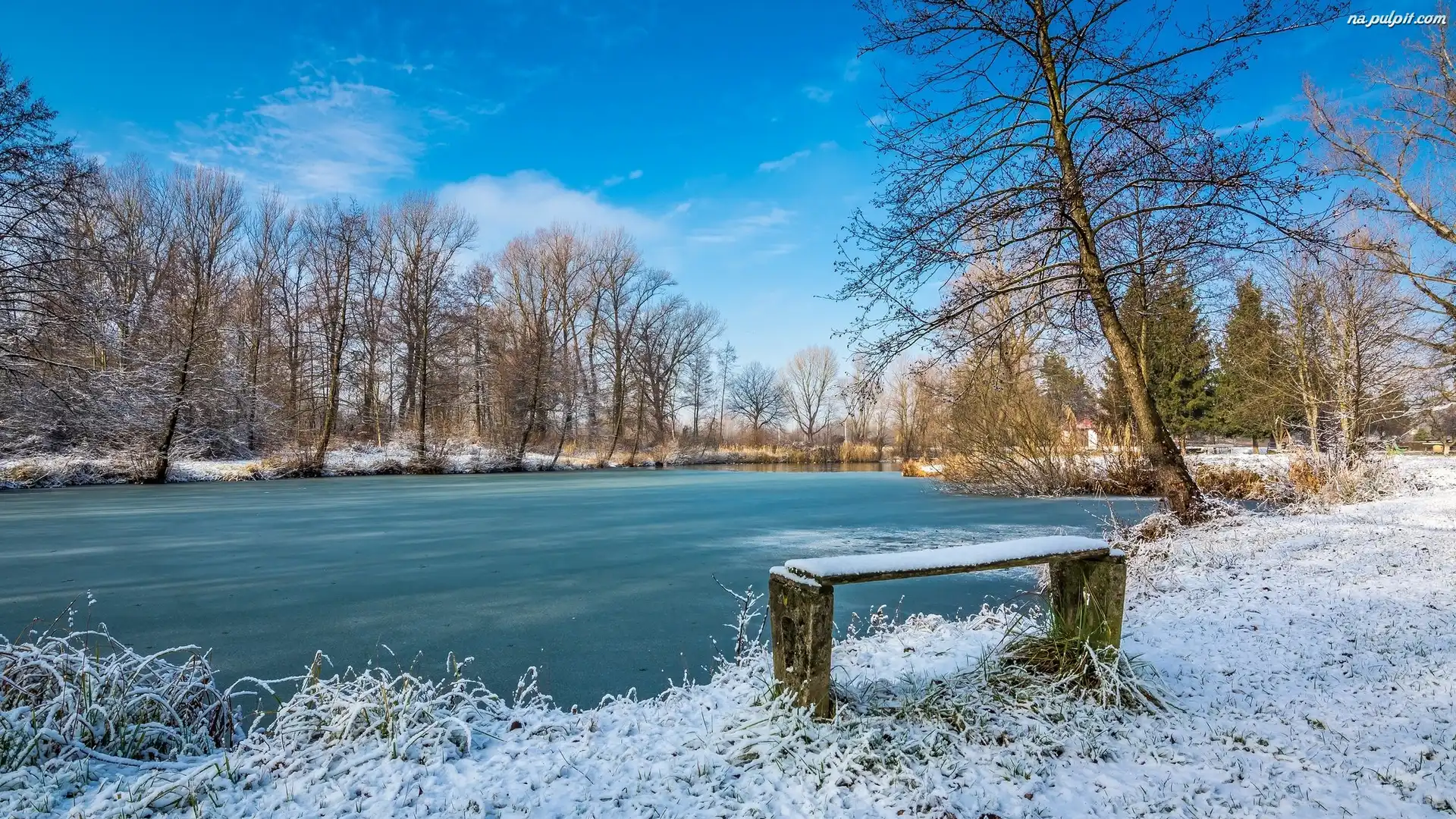 Śnieg, Ławeczka, Rzeka, Zima, Drzewa Na Pulpit
