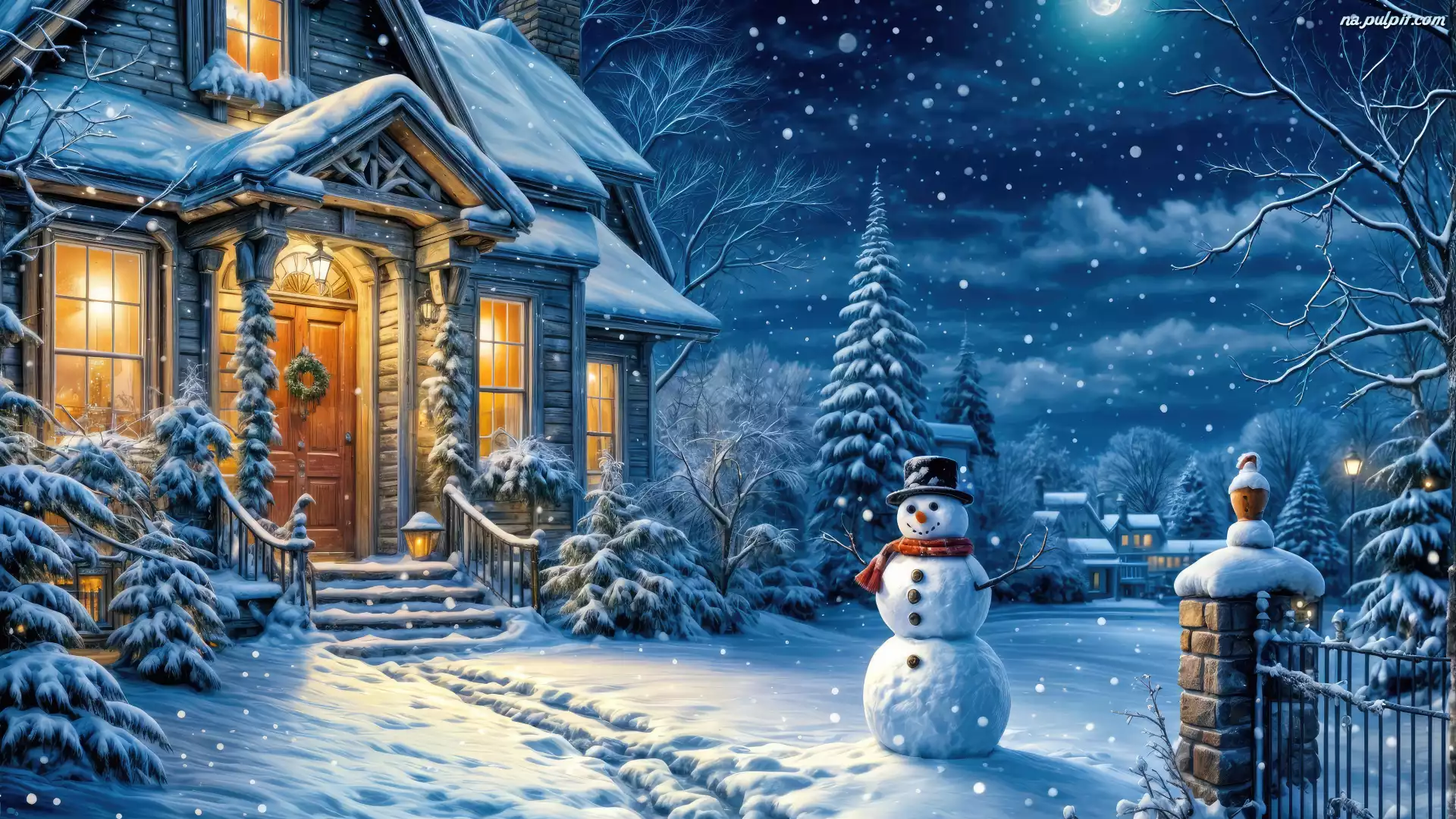 Śnieg, Drzewa, Bałwan, Zima, Oświetlony, Dom, Ogrodzenie Na Pulpit